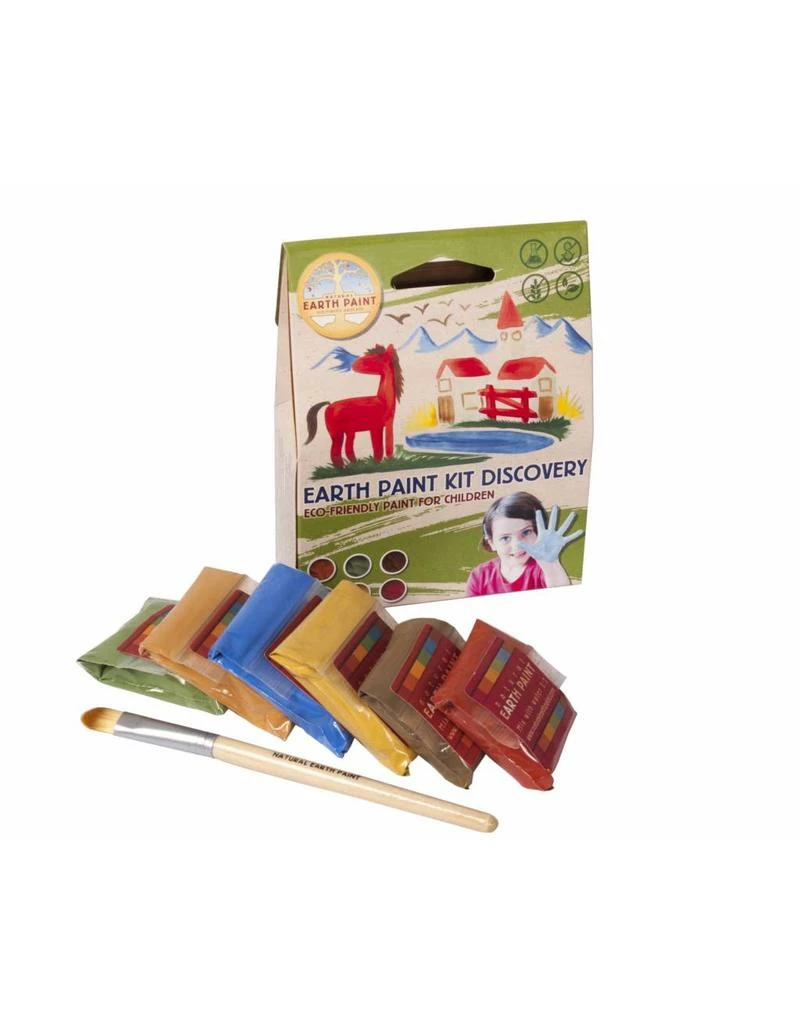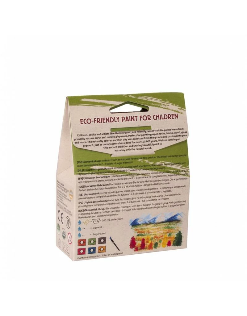 This paint kit includes 6 colours of mineral pigment (brown, red, orange, yellow, green and blue) that will make 1 litre of water based paint. This set also includes a recycled brush with bamboo handle and corn fibres.