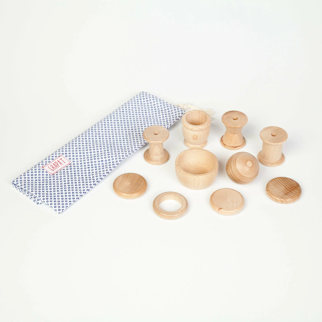 This game contains different wooden pieces which are designed to be included in the treasure basket. The basket is a type of game that improves logical-mathematical thinking, based on sensorial and discovery games which are the first games that children play. The set of elements in Grapat’s basket are just a part among all material that can be included. It is important to give children other elements such as metal, clothes, glass, etc.