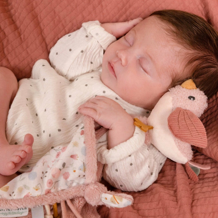Soft and sweet. No nursery is complete without a comforting Cuddle Cloth close by. That makes it an ideal baby shower gift. Dressed in our latest Flowers & Butterflies print, this soft-hued iteration of a tried-and-true newborn must-have features a little bird cuddle toy, easy-to-grab knots and fun labels to explore. It calms and helps a little one to fall asleep. Plus, you can attach a pacifier or teething ring to the cotton loop in the cloth.