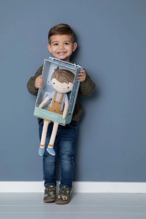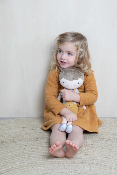 Jim the cute plush cuddle doll in his cool dungarees is soft and lovely to cuddle with. Jim can sit up and likes to go with you in the Little Dutch wooden doll stroller.