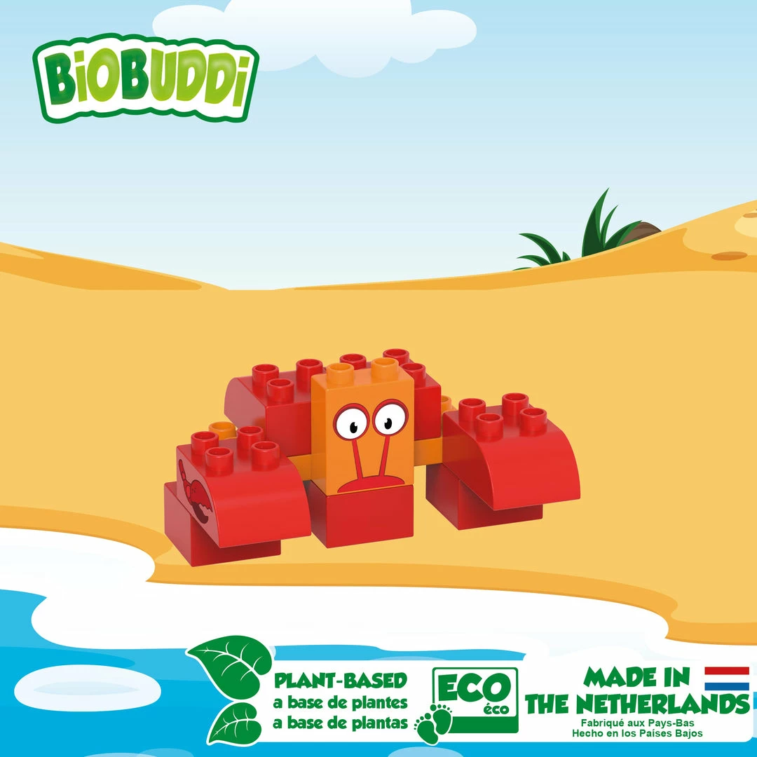 Build this cheerful red crab together with your child. By building and playing with the Animal planet from BiOBUDDi, children develop not only motor and creative skills but also cognitive skills. Stimulate your child’s imagination and creativity with BIOBUDDI toy blocks. This building set consists of 15 parts, 11 building blocks, 6 expression cards for playing an educational memory game, and a nice textbook.