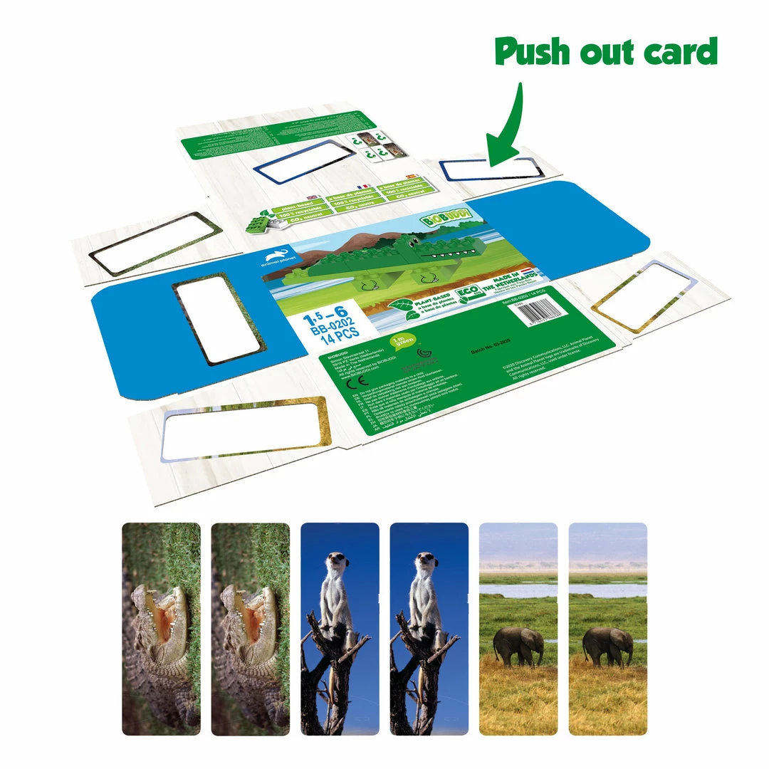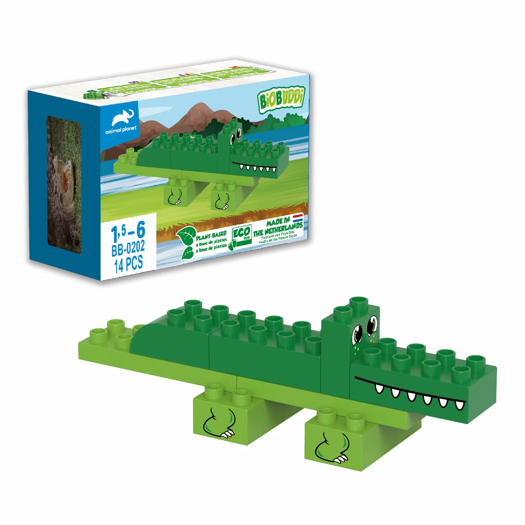The crocodile is one of the largest reptiles in the world. By building and playing with animal toys from BiOBUDDi, children develop motor and creative skills as well as cognitive skills. Stimulate your child’s imagination and creativity with the BiOBUDDi toy blocks. This building set consists of 14 parts, 8 building blocks, 6 expression cards for playing an educational memory game, and a textbook.Discover and learn about the crocodile from BiOBUDDi in a playful way. The Animal planet crocodile play set consists of 8 building blocks with multiple prints and 6 expression cards. Use these building blocks to build your own Animal planet crocodile together with your son or daughter. Print the brand new express cards from the 100% recyclable packaging and play an educational memory game.