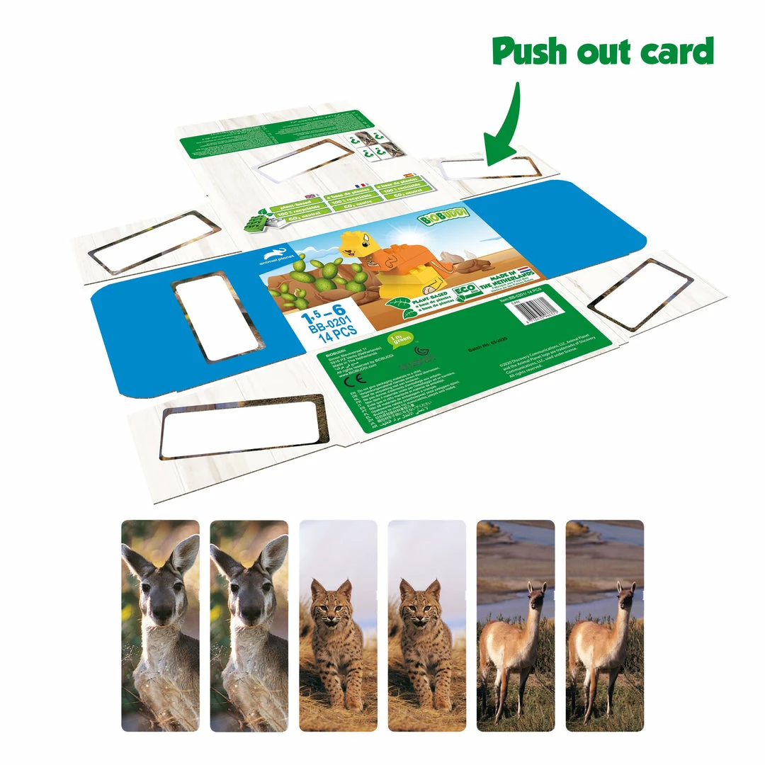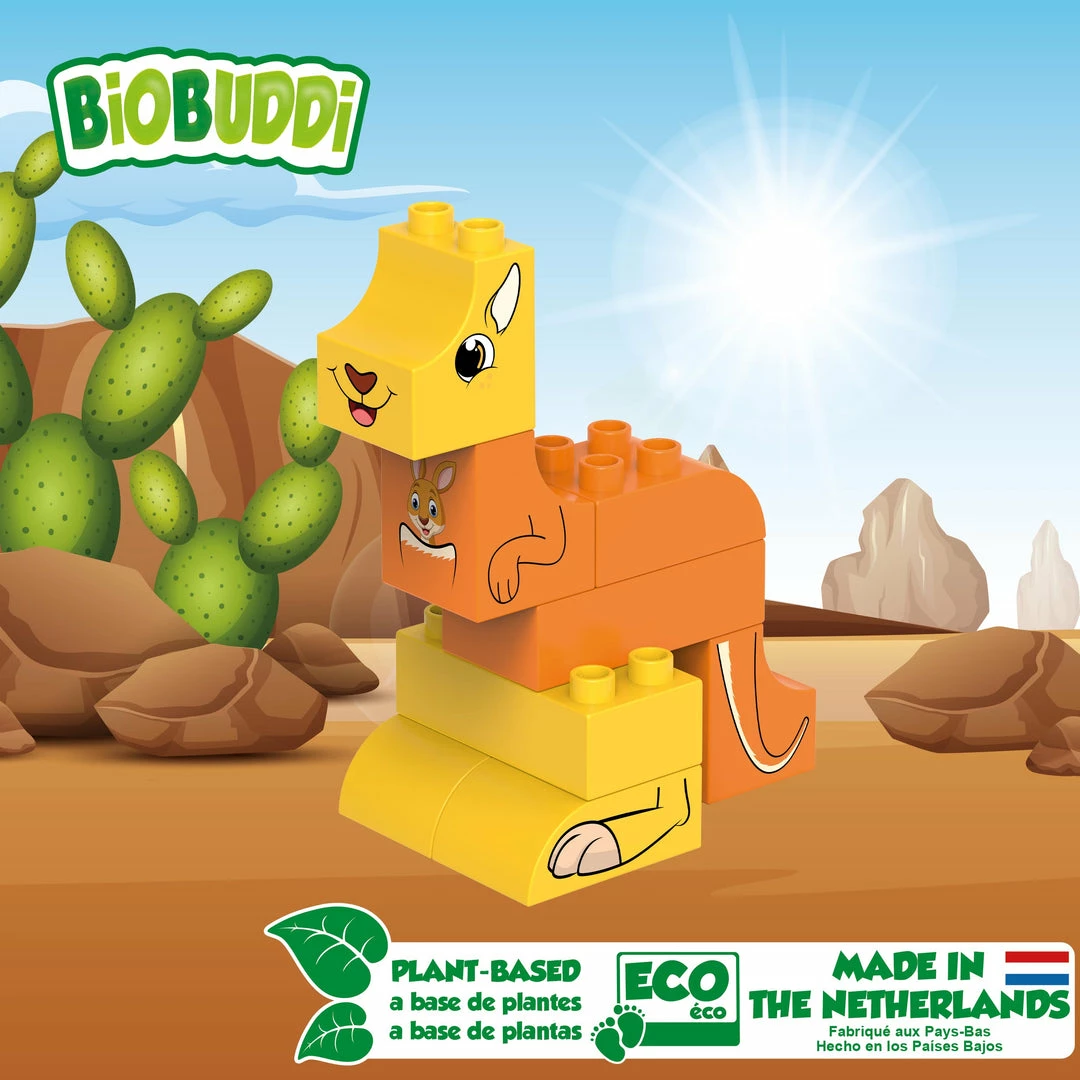 Jump on two legs through the outback in Australia with this cheerful kangaroo. This kangaroo is part of the animal planet play set and easy to build. By building and playing with BiOBUDDi’s toy blocks, children develop not only motor and creative skills but also cognitive skills. Stimulate your child’s imagination and creativity with the animal planet play set from BiOBUDDi. This building set consists of 14 parts, 8 building blocks, 6 expression cards with which you play a memory game and a nice textbook.The Animal Planet – Kangaroo play set consists of 8 building blocks with multiple prints and 6 print cards. Use these building blocks to build your own Animal planet kangaroo together with your son or daughter. Print the brand new express cards from the 100% recyclable packaging and play an educational memory game.