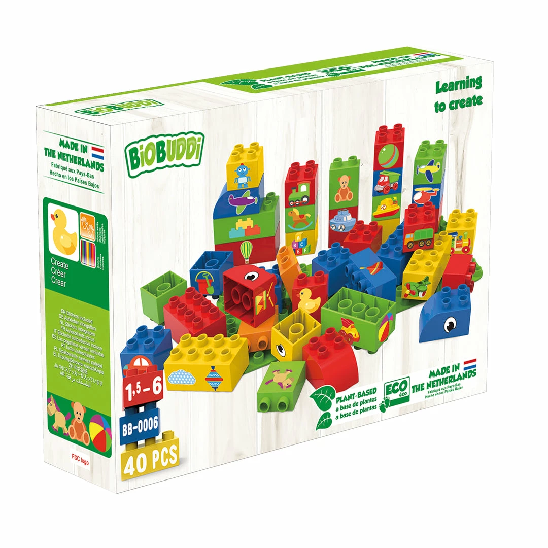 The bio-based toy blocks are made from the remains of sugarcane plants and are produced in the Netherlands. The building blocks are eco-friendly, sustainable, recyclable and specially designed for little hands. Parents can decorate the colourful blocks with different images to bring make-believe worlds to life! Stimulate your child’s development with a colour sorting or fine motor activity and build a creation together with your toddler or preschooler.