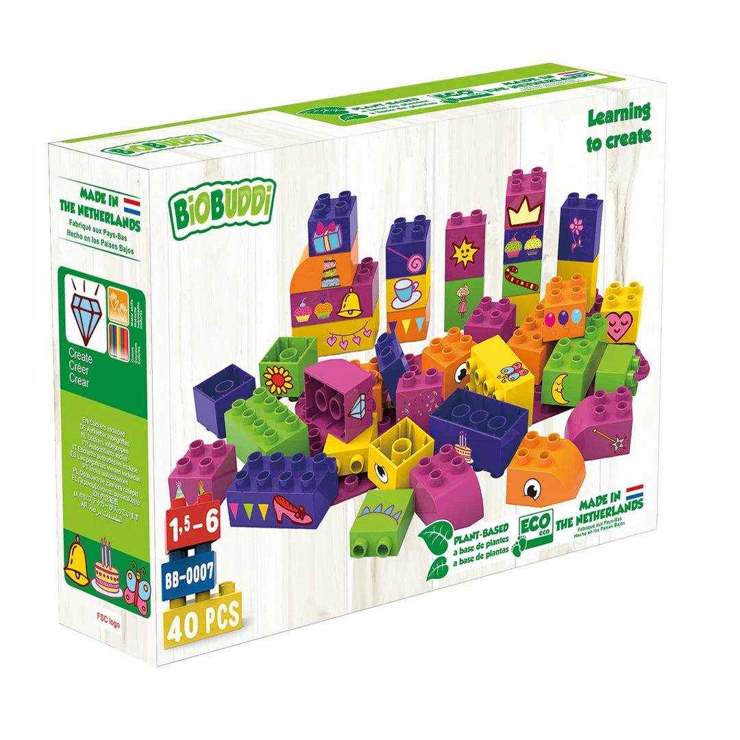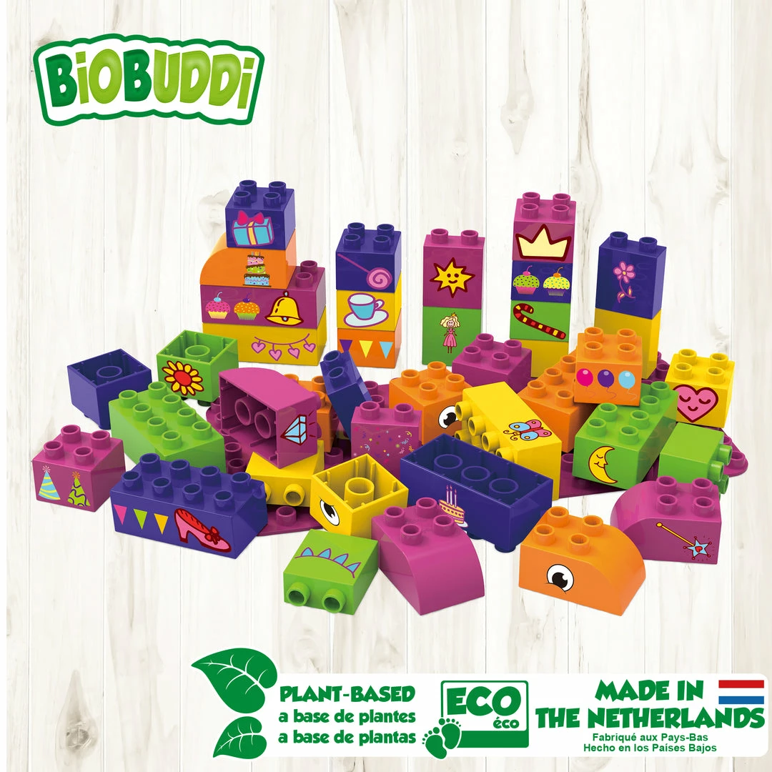 What would you like to build today? Would you like to create a big castle with a decorated hall to organise a party with sweet muffins? Create it on the baseplate with the educational blocks! Children learn through play with the biobased building blocks from BiOBUDDi.