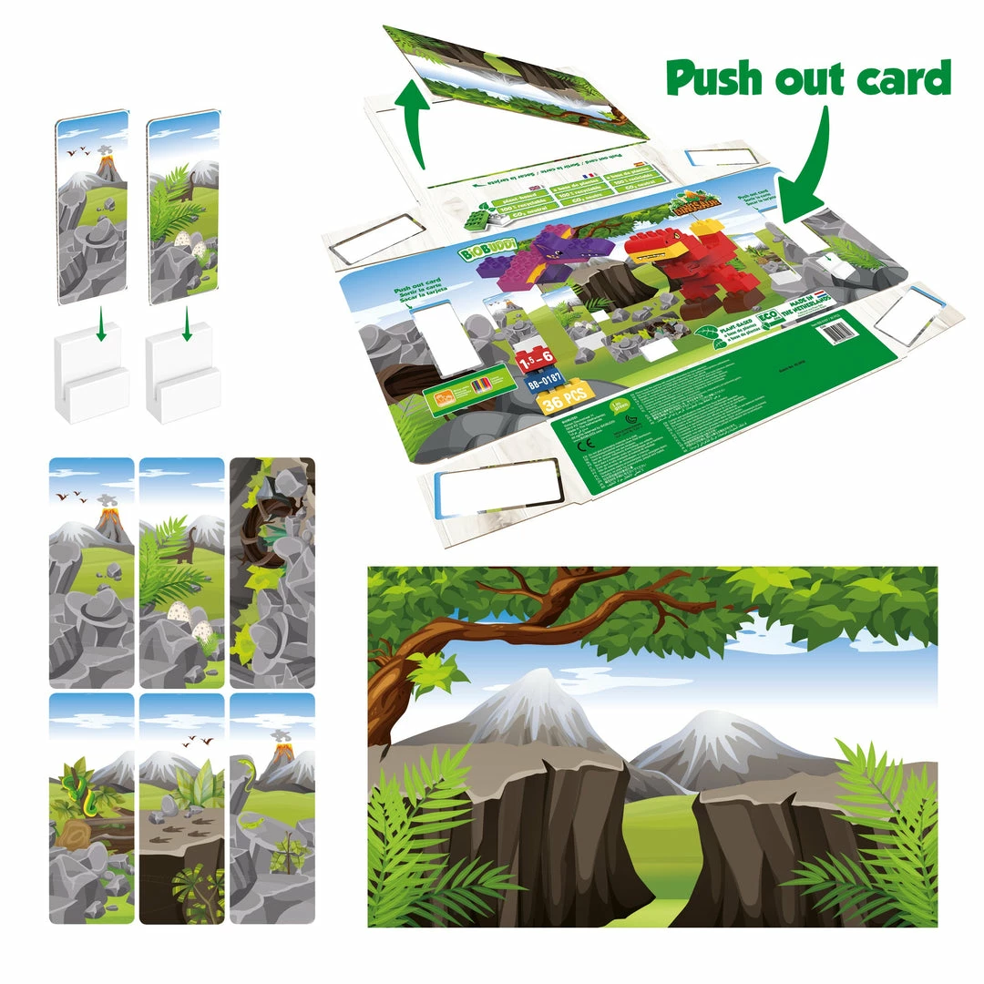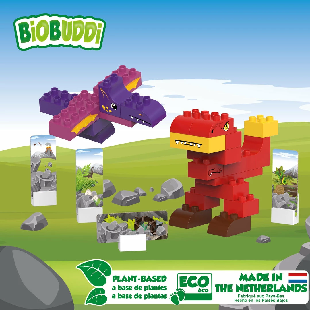 The tough new T-rex Toy Set from BiOBUDDi consists of 24 building blocks, of which several prints have it. Furthermore, there are 6 slot blocks and 7 express cards. It is a beautiful toy for a child of 2 years and older. There are not 1 but 2 very cool dinosaurs. The background is brand new, you can express this yourself from the 100% recyclable packaging.
