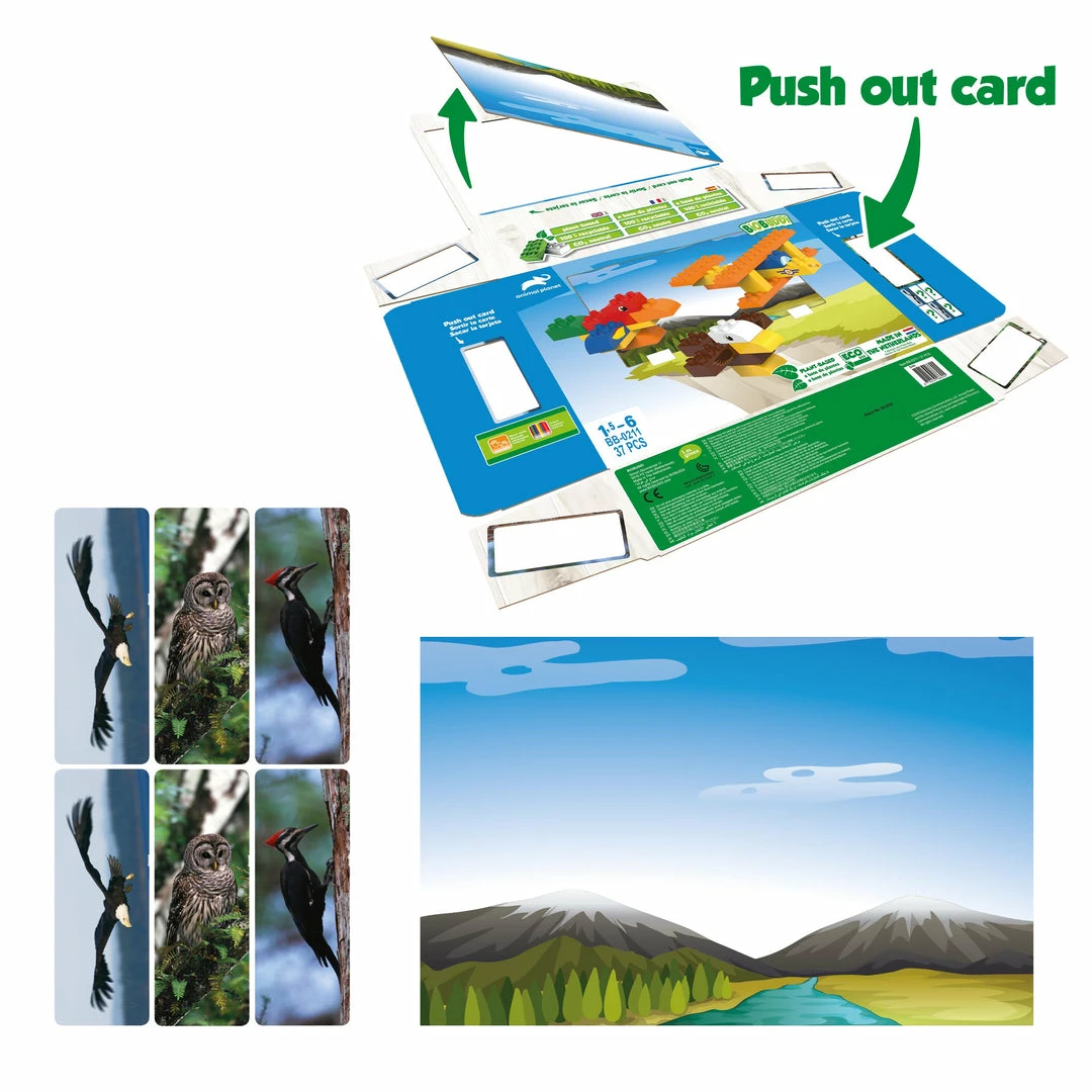 The Animal planet plane playset is perfect for your adventurous son or daughter. Make your own eagle, colorful parrot and plane with the 28 building blocks. So you build two beautiful animals and a super cool plane. Fly through the animal world together with the other Animal planet playsets. Use the large background card from the packaging to complete your own animal world. Then put them in the 2 supplied slot blocks to put them upright. You can also easily remove the other 6 express cards from the recyclable packaging and play a unique and educational memory game. All this provides hours of play and build fun!