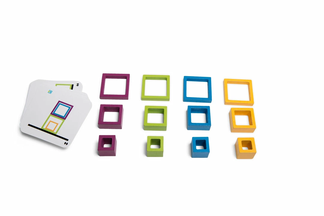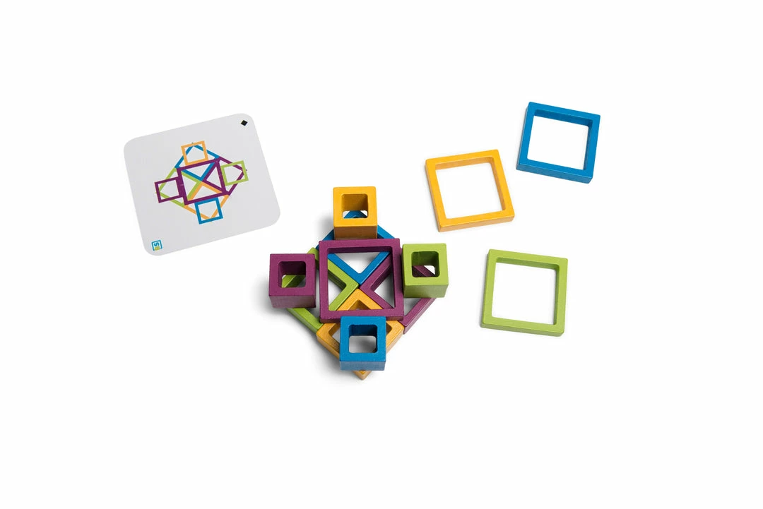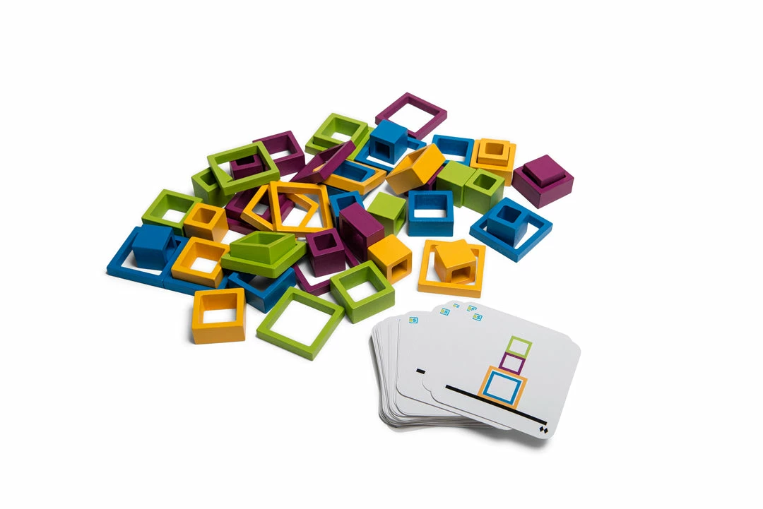 Flip a card and build the pattern as quickly as possible. Who is the best and quickest builder? The card will tell you to build it flat, on the table or up in the air.