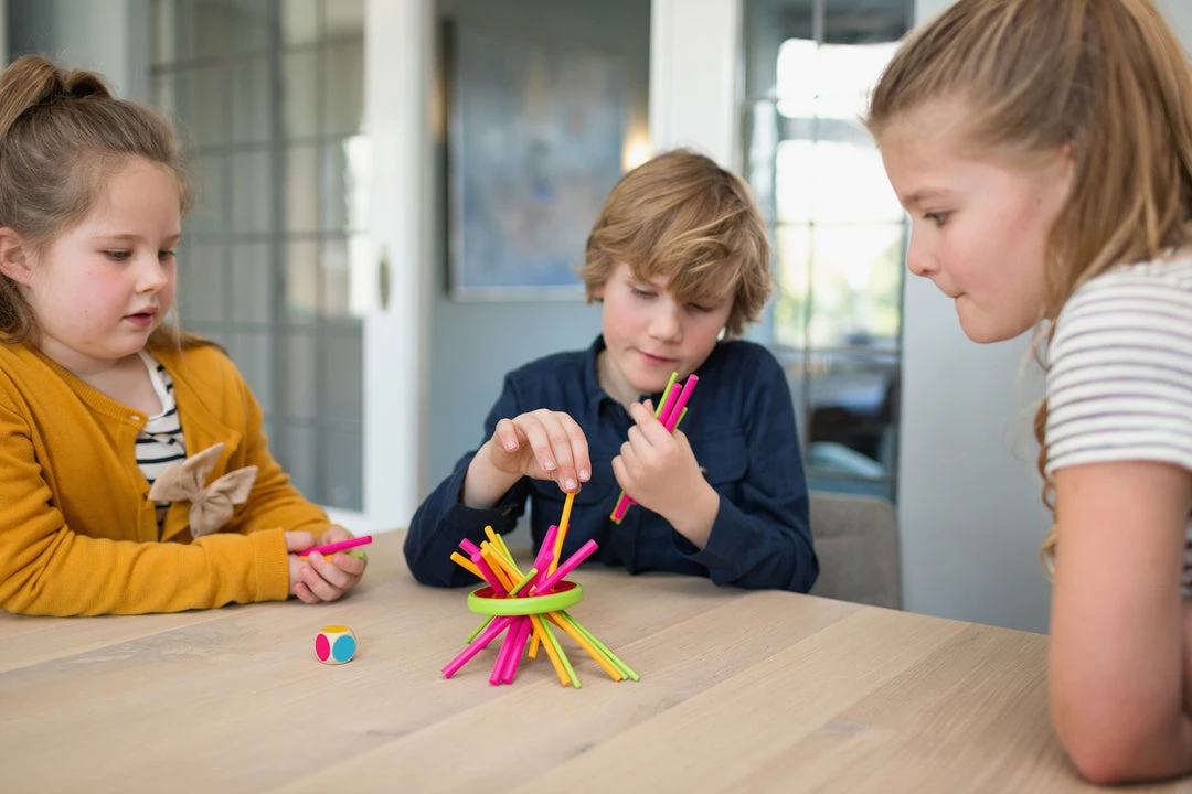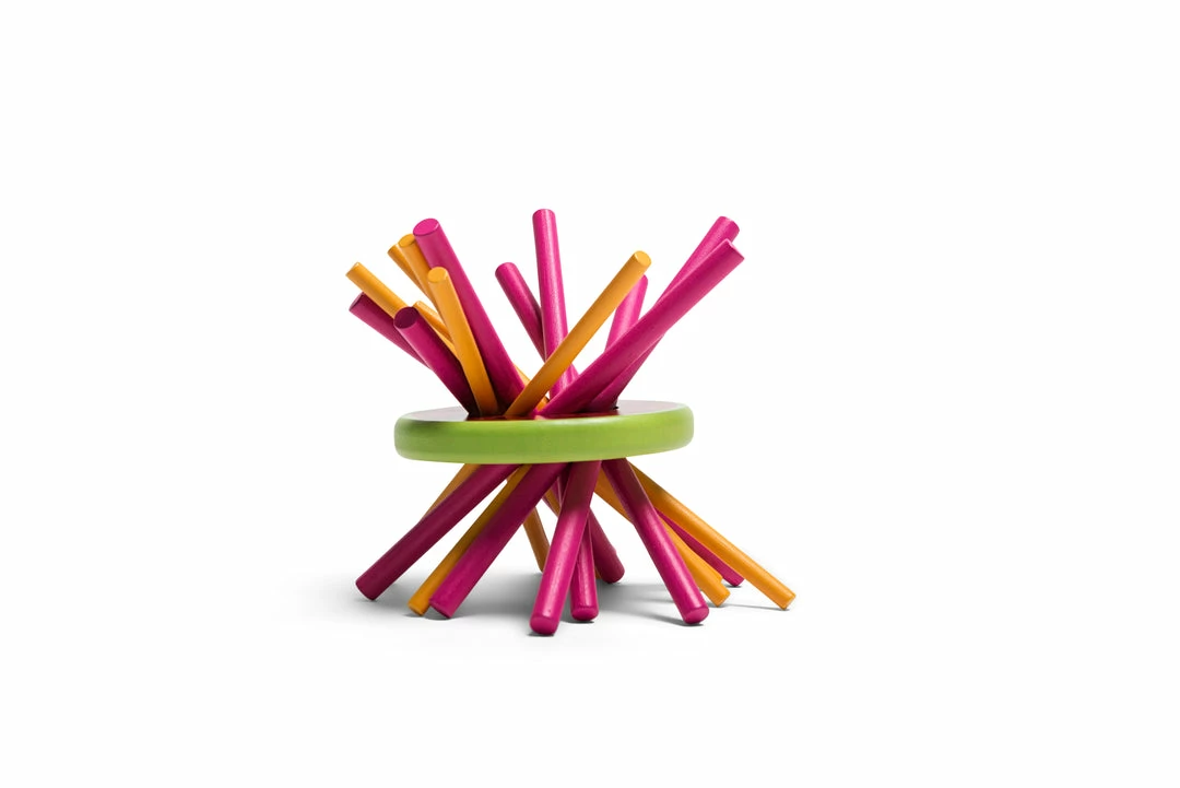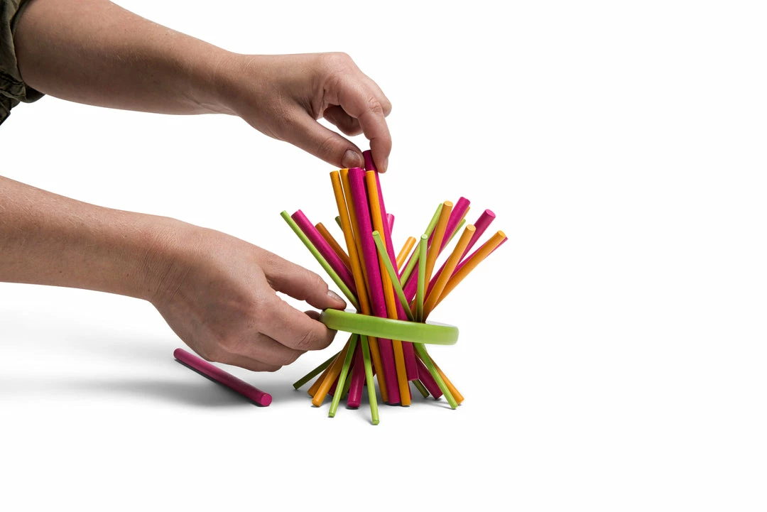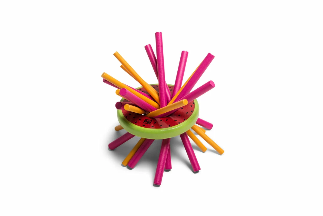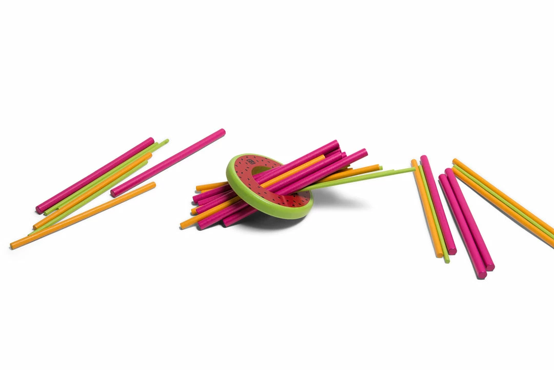 Throw the dice and take out the stick with that colour. Each colour is worth different points. If you let the melon fall, you are out of the game and the other players can count their points. The player with the most points wins the game.
