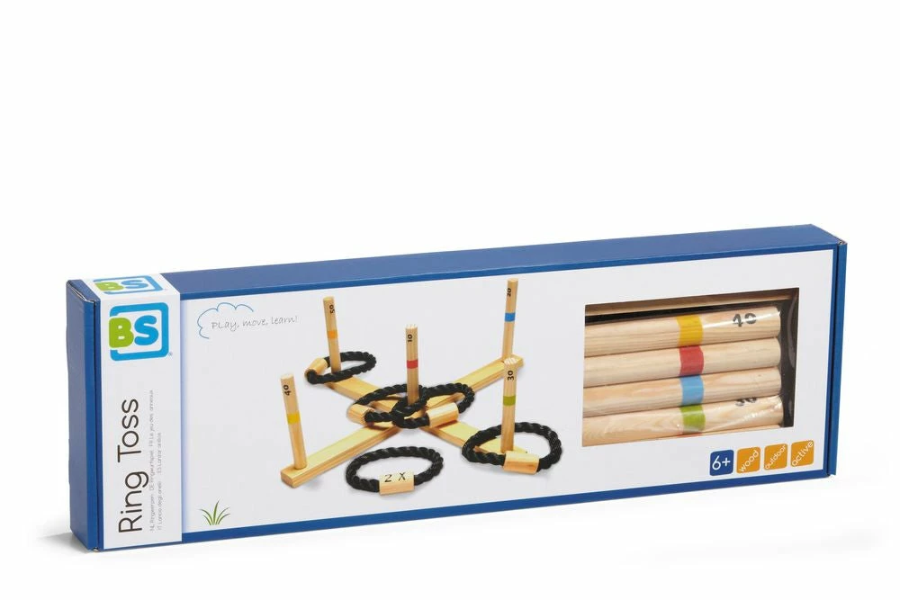 Throw the rings around the wooden posts. A challenging game for young and old.
