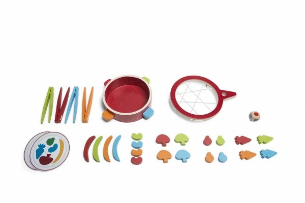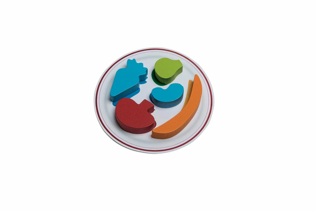 Roll the dice and rotate the lid. Now use the tweezer to collect your vegetables. Put them on your plate, but don’t drop the veggies on the table or on your plate. It would be a waste of food!