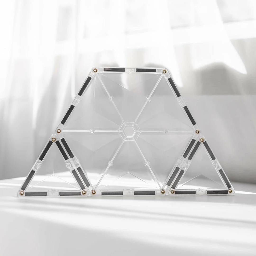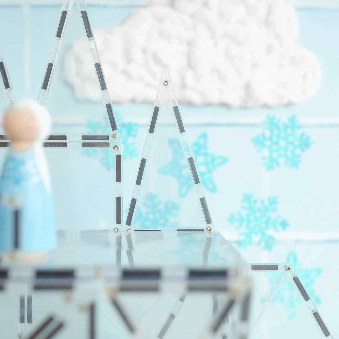 Featuring transparent bevelled magnetic tiles in a variety of shapes (including large hexagons!), this pack will allow you to see through to a whole new dimension of Connetix play. Unleash your creativity to construct inspired designs from Frozen castles, glistening snowflakes and icy igloos, to functional windows, crystal glasshouses or pretend glasses.
