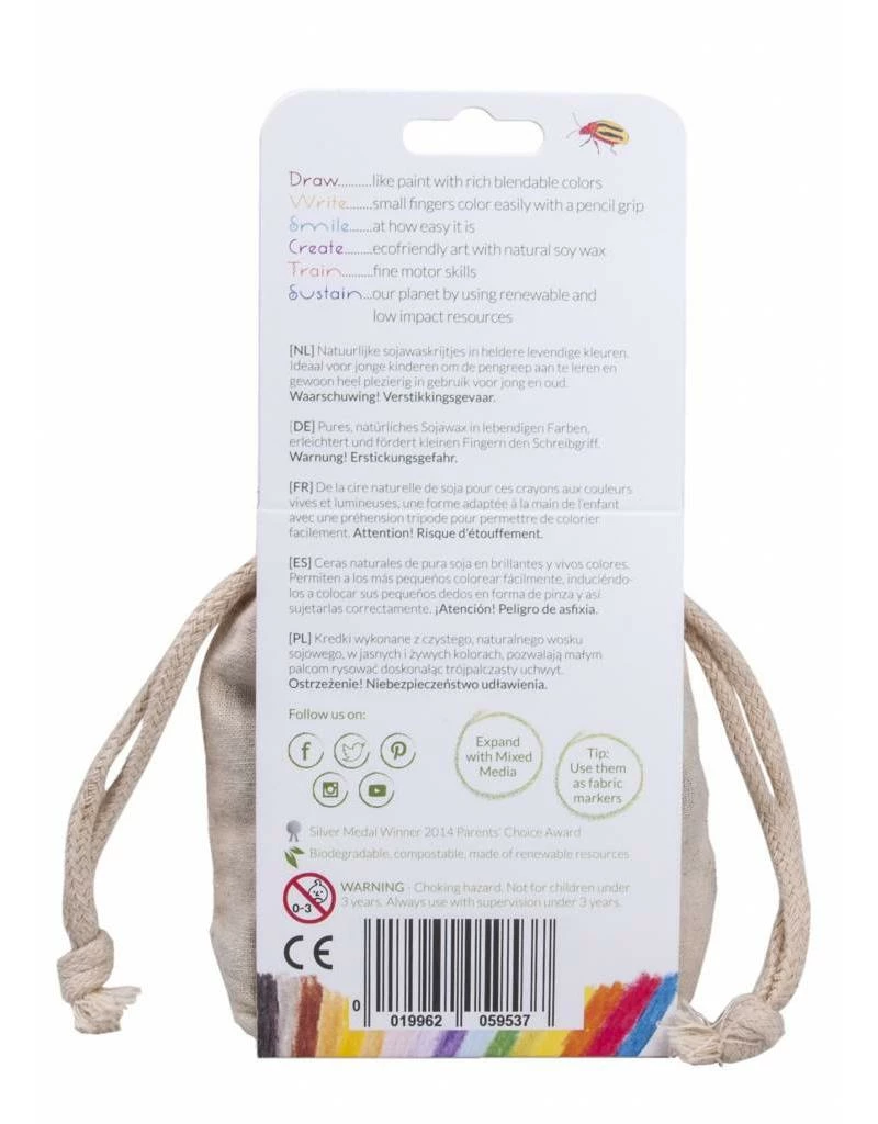 MULTICOLOUR CRAYONS – Thirty-two (32) non-toxic, soy wax crayons in these colours: red, green, blue, egg yolk yellow, black, brown, orange, purple, pink, grass green, sky blue, sunshine yellow, grey, brown, peach, white, strawberry cream, honey wheat, gold, pumpkin spices, coffee, tree bark, cranberry , rose red, magenta, periwinkle, turquoise, aqua, pine, autumn green and silver in a cotton muslin bag.