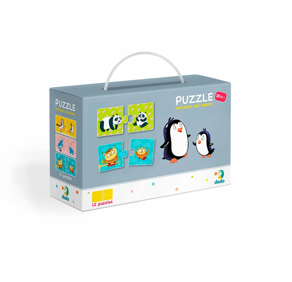 In a box of 12 puzzles, each of which consists of two elements, you need to connect the elements so that each animal corresponds to her baby.