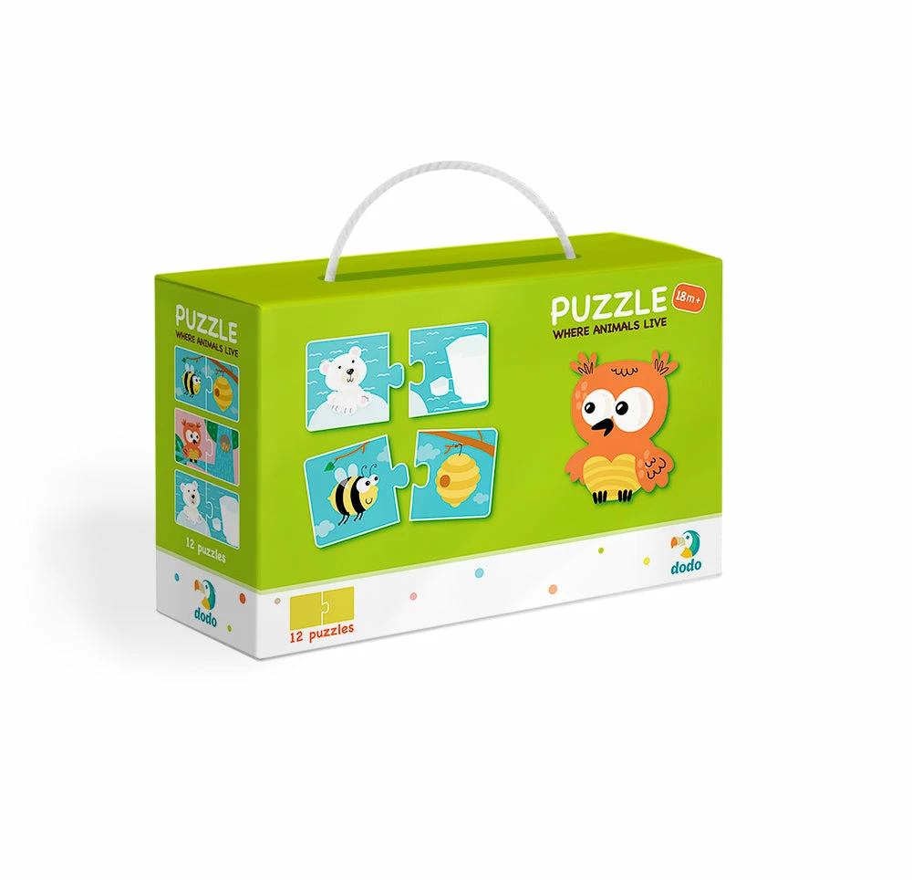 In a box of 12 puzzles, each of which consists of two elements, you need to connect the elements so that each animal corresponds to its home.