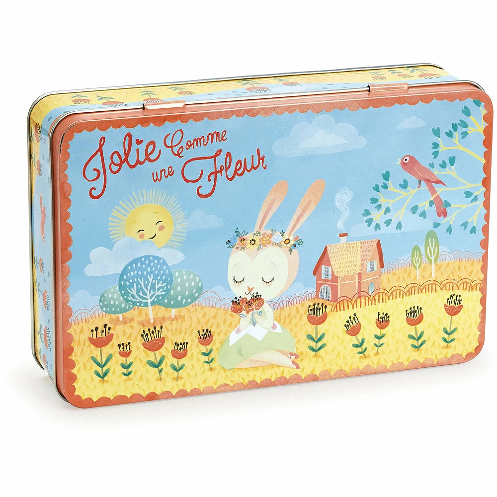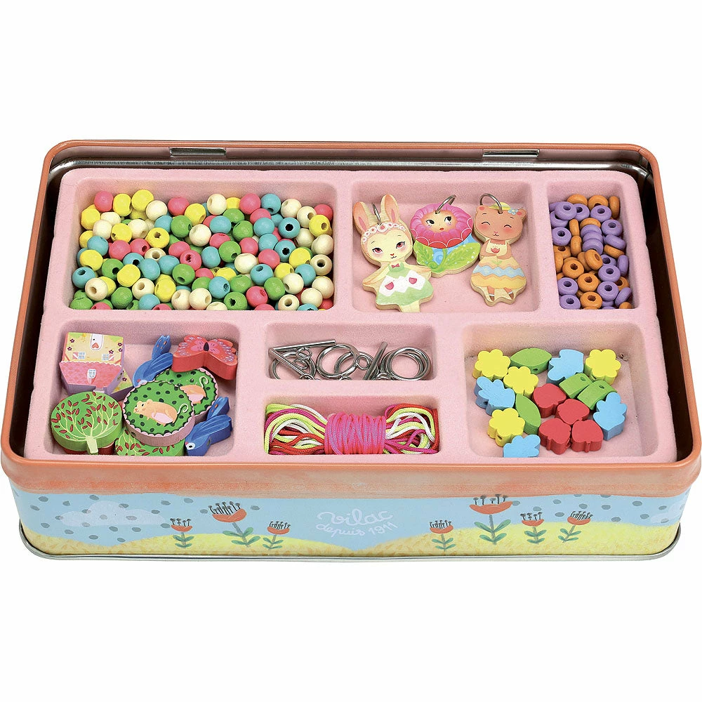 Beautiful wooden beads of different sizes with very original pendants, in a garden-themed metal box, to create necklaces and bracelets.