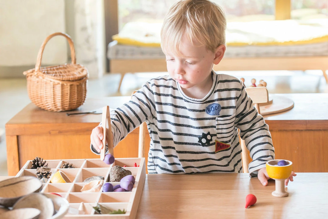 This tray with dividers allows to offer a great variety of materials at the same time. The compartments contain, contain and limit and so the children can sort and classify all those small elements that are part of their environment.