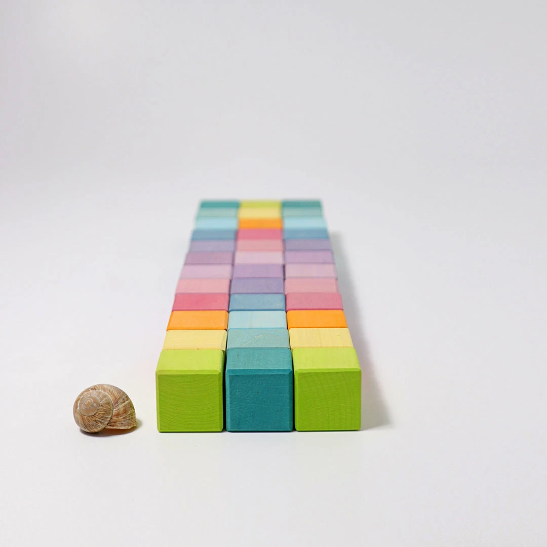 The elemental cubic form of these blocks inspires children to build simple walls, foundations, fences, stalls as well as houses, towers and castles. The basic shape is also very useful for making tables and stools.
