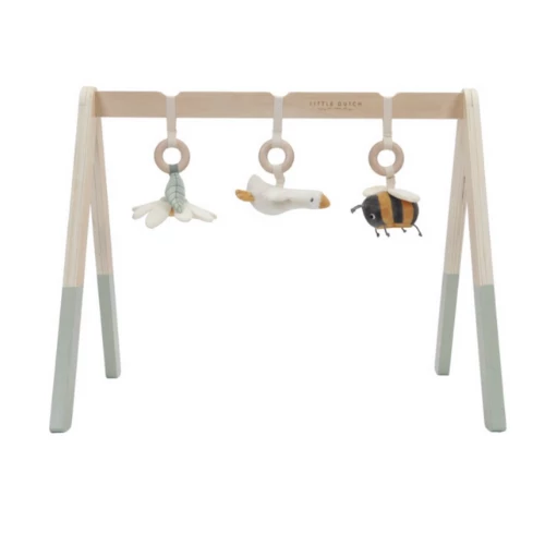 The Little Goose baby gym is made of sturdy wood and includes three soft toys that have different textures to touch and feel. Babies love to explore these cute toys. Bee has a small mirror on her tummy, Little Goose rattles and the flower leaves have a crinkly touch. The baby gym promotes hand-eye coordination and stimulates the senses.