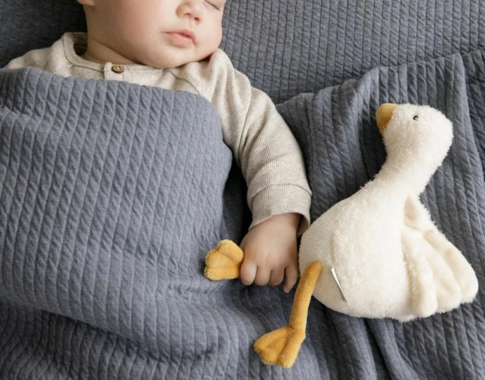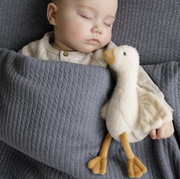 Little Goose is 20 cm high and made of incredibly soft plush. He can sit upright and looks great in any nursery. But he would rather be with you all day; to play, to cuddle and to sleep with you.