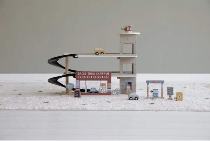 Stop by the garage to fill up on gas, park your car or get it cleaned in the carwash. The wooden garage is one of the many playsets that can be connected to the Little Dutch railway set. The garage includes a helicopter platform and the wooden figurines and elements all have detailed illustrations on both sides. Complete the garage with the railway train XXL set and additional extension sets for hours of fun play.