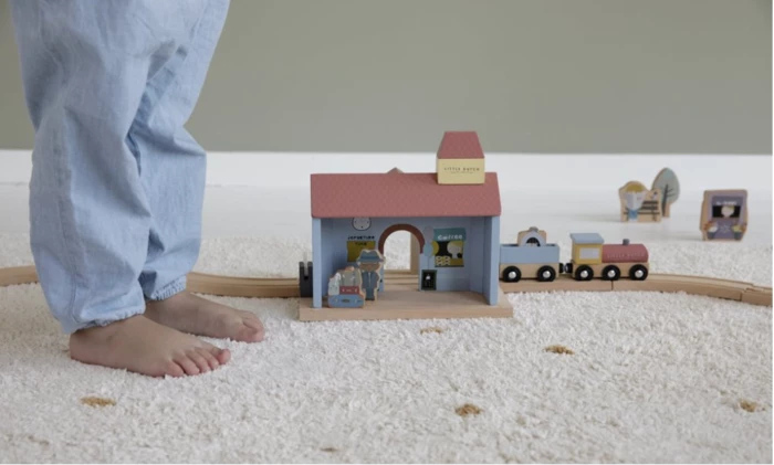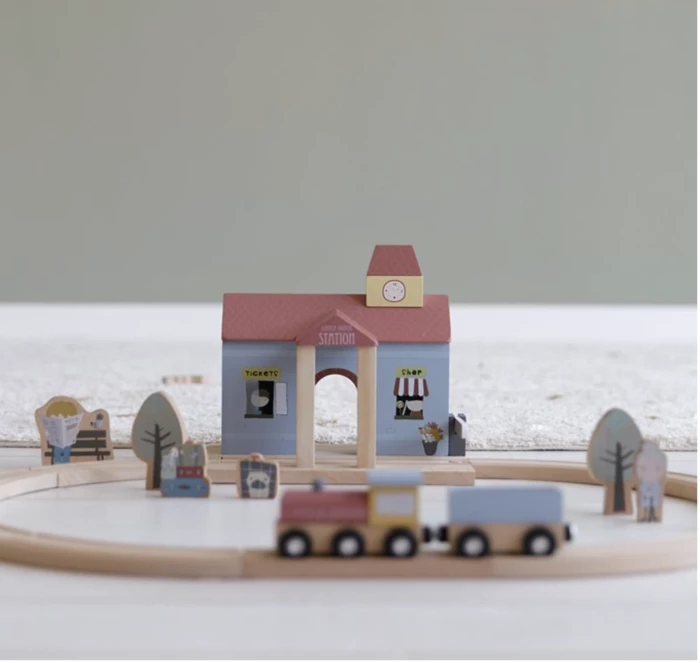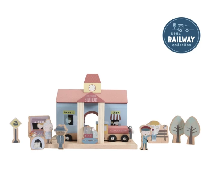 Let’s go on an adventurous train trip! Pack your bags, bring your pet and hop on the next train. This wooden train station is one of the many playsets that can be connected to the Little Dutch railway train XXL set. The wooden figurines have detailed illustrations on both sides and can be placed on the train wagon for a nice ride. Complete the train station with the railway train XXL set and additional extension sets for hours of fun play.