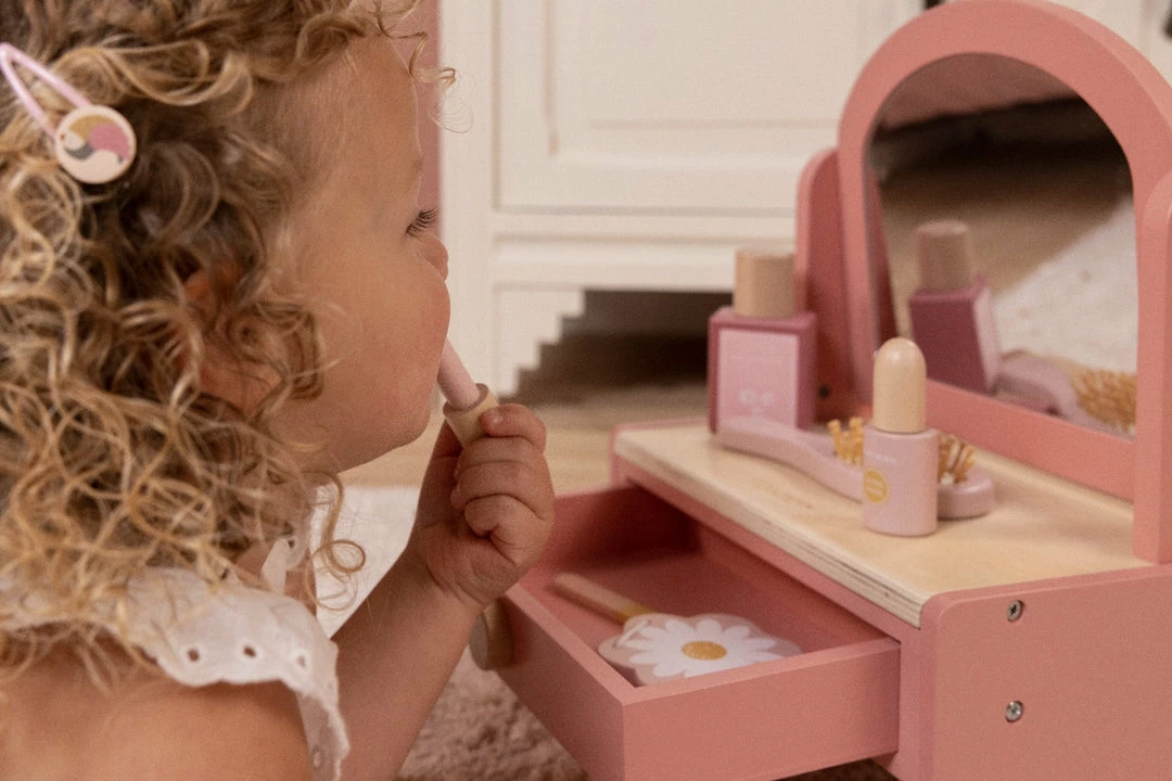 Mirror, mirror on the wall. This wooden vanity table for kids is designed to encourage imaginative play. The vanity table comes with a rotating mirror and an array of pretend play beauty products, including a hair brush, perfume, lipstick, eye shadow, nail file and nail polish. It also has a storage drawer to keep (not included) hair bands and clips. Rendered in a pink tone, it’s a nice addition to any playroom. Designed for ages 3 and up.