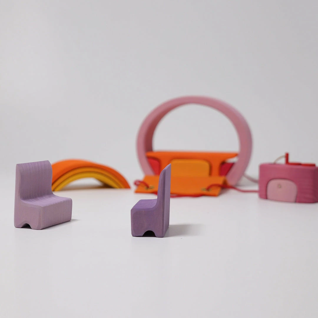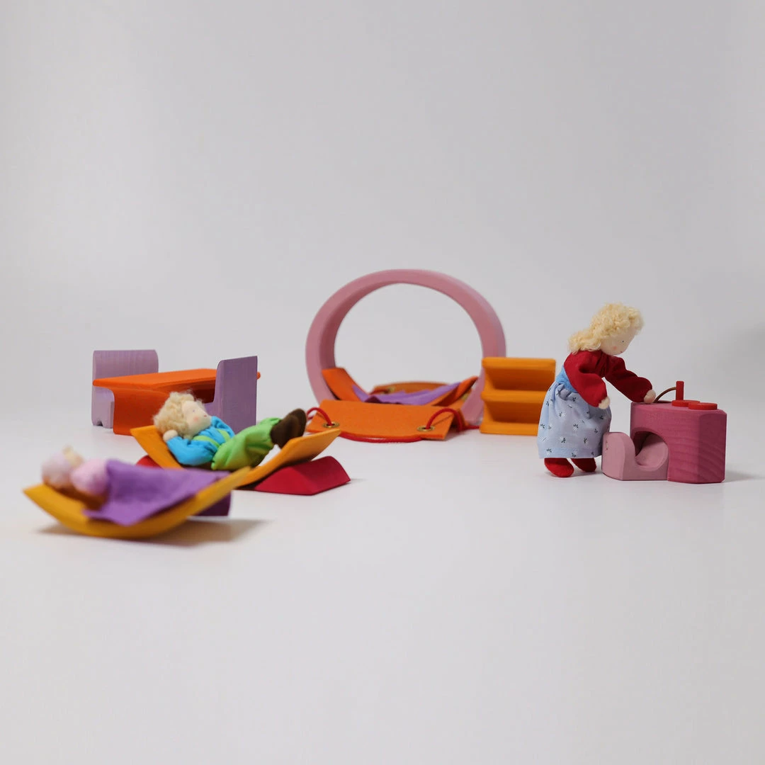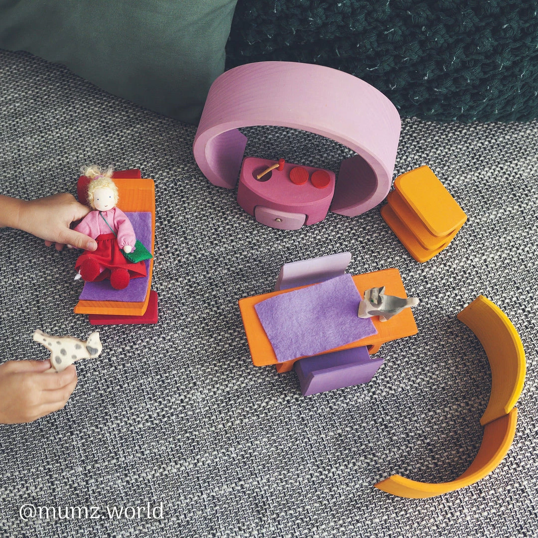 This small Mobile Home contains: roof, 3 arcs (bed, cradle, wall…), 2 felt pieces, cooker, 2 chairs, table and a shelve. The 14 pieces are held together by an orange felt cover and the mobile home is easily transportable with two cotton cords. The children can carry it to their friends, the restaurant or in summer in a park for playing. For example our dollhouse dolls can live in this house (eg. Art. No 20000/20010/20050/20060).