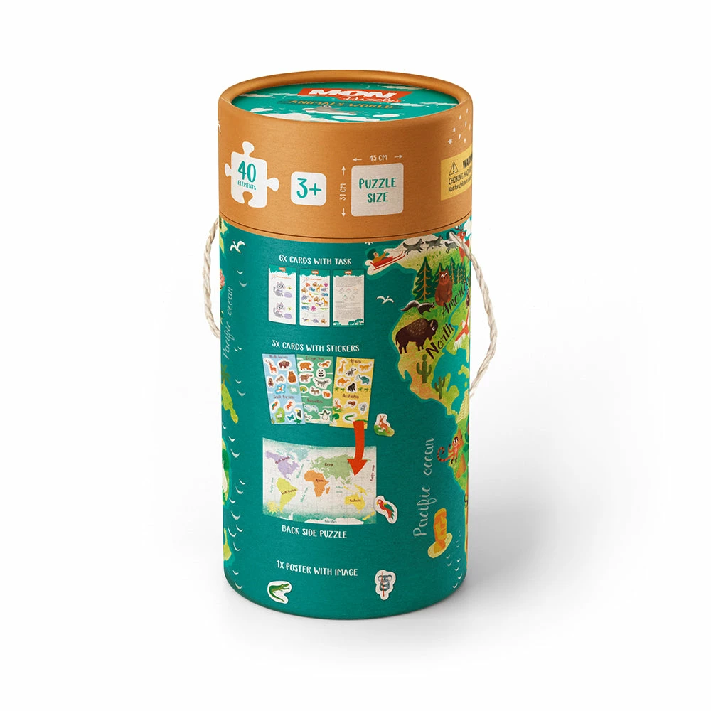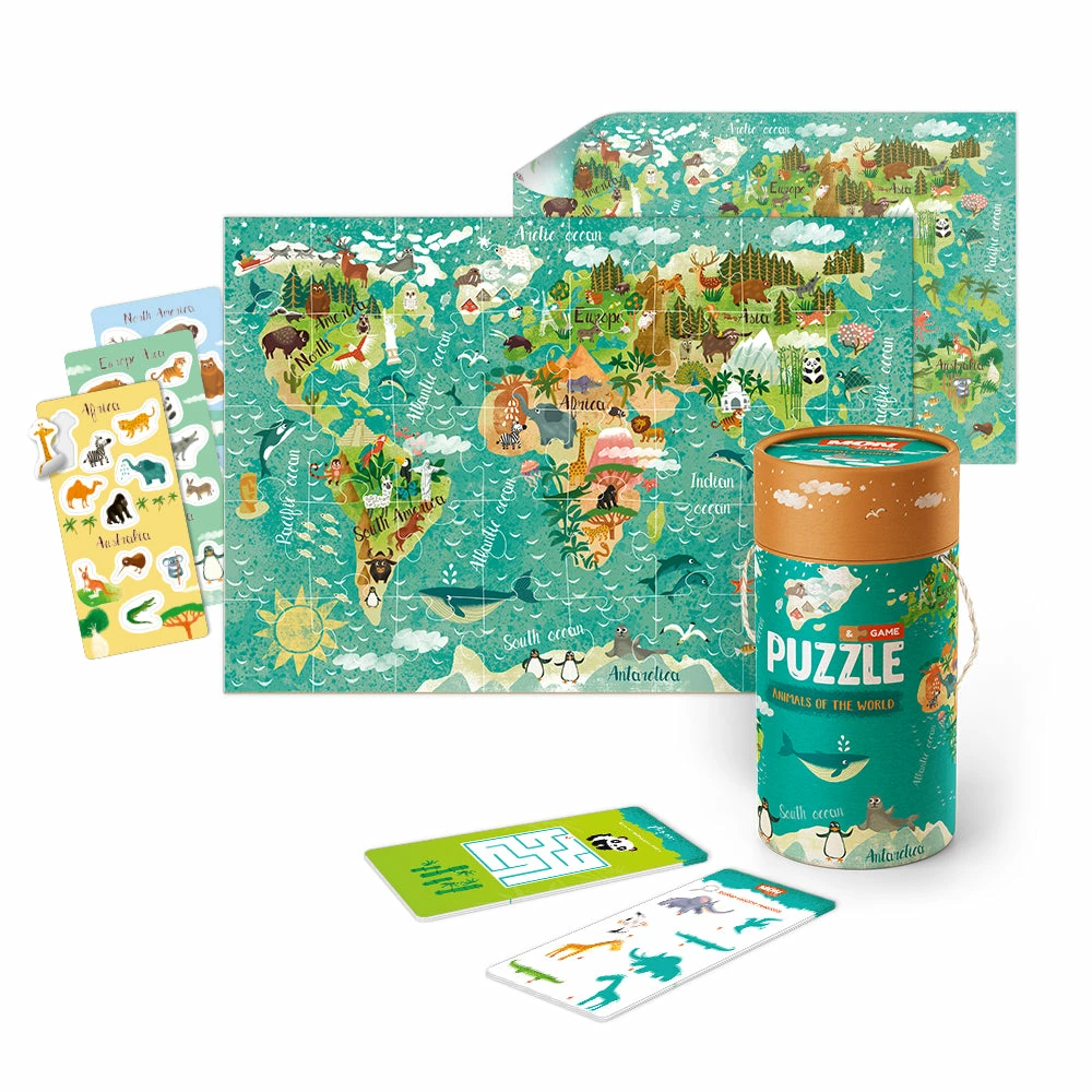 Complete set of one puzzle: 1 two-sided puzzle, 1 two-sided poster, 4 cards with stickers, 6 cards with tasks