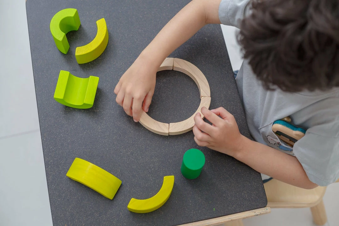 Complete circles with these curve blocks. Children will learn about ordering and comparing the height and the size of each different circle. The set consists of 9 curve blocks and a cylinder.