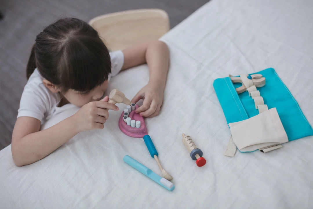 Pretend to be a real dentist! This set teaches children at a young age to understand the importance of tooth care. It includes 4 basic dental tools, 1 toothbrush, 1 set of teeth with 3 spare teeth and 1 doctor case.