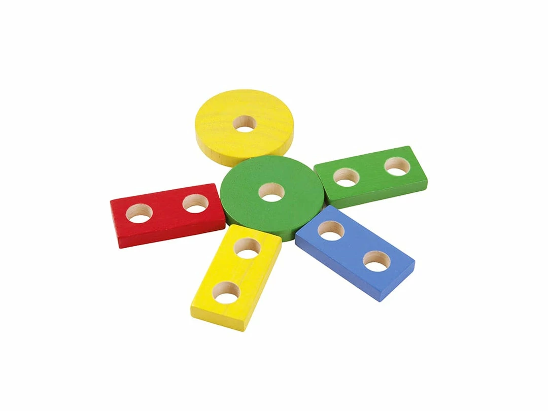A set of four geometric shapes which can be stacked together according to the number of holes in the middle of each one.