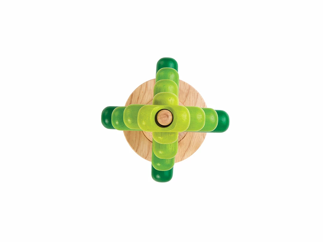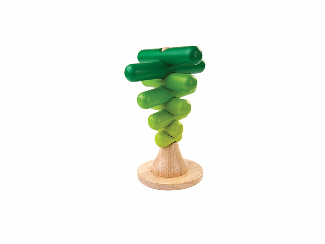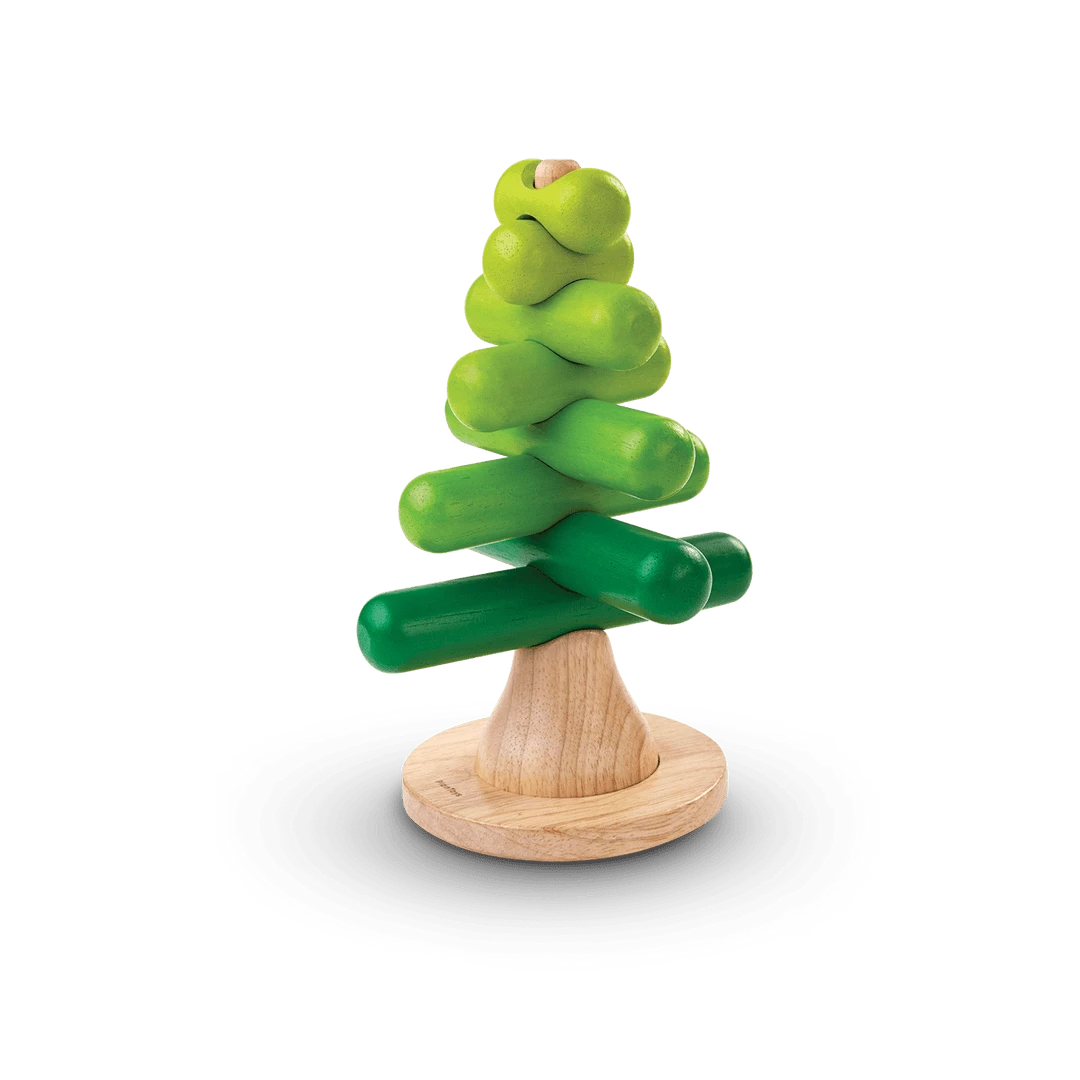 INCLUDES: The Stacking Tree consists of 8 wooden pieces varying in size and shades of green with a base for stacking.