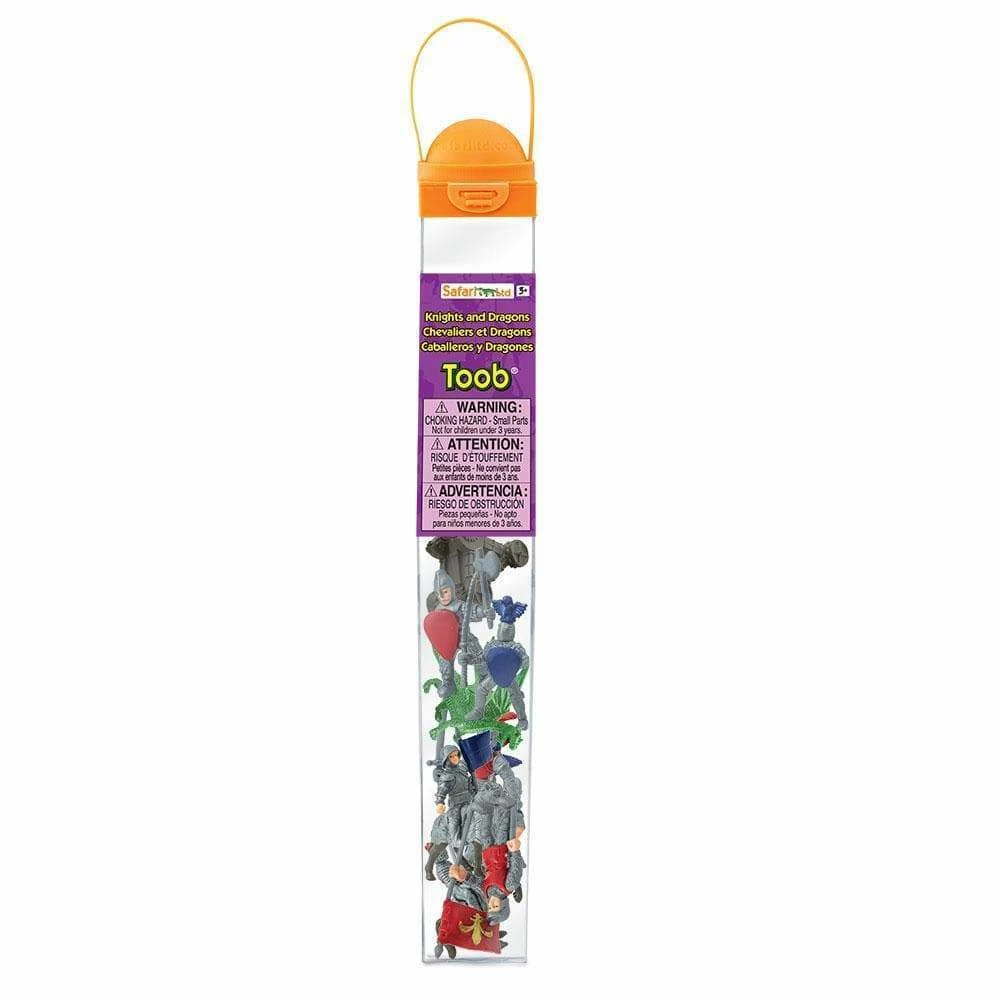 Put on your armour and gather your knights to drive the evil dragon scourge from the land! This Toob contains four knights of the red kingdom and four knights of the blue kingdom, all ready for fierce battle, along with a catapult and a terrifying green dragon.