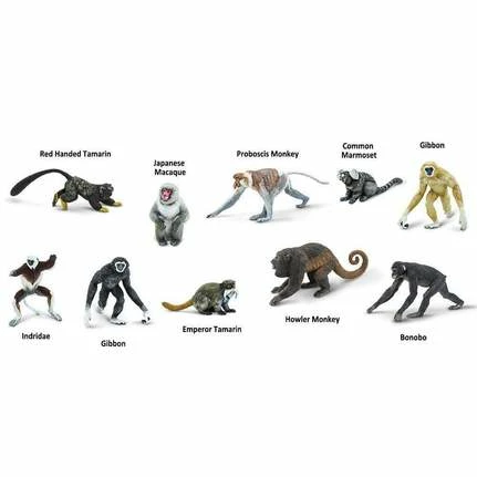 - Characteristics: The primates in this TOOB span from lemurs to monkeys to apes. It includes ten pieces: The Indri, a Japanese Macaque, a Howler Monkey, a Common Marmoset, a Red-handed Tamarin, an Emperor Tamarin, a Proboscis Monkey, a Bonobo, and two Gibbons. The Indriidae is a lemur (specifically a Coquerel’s Sifaka), while the Bonobo and Gibbons are apes. The rest are monkeys. These miniature figures are posed dynamically and feature scientifically accurate, highly detailed sculpting.