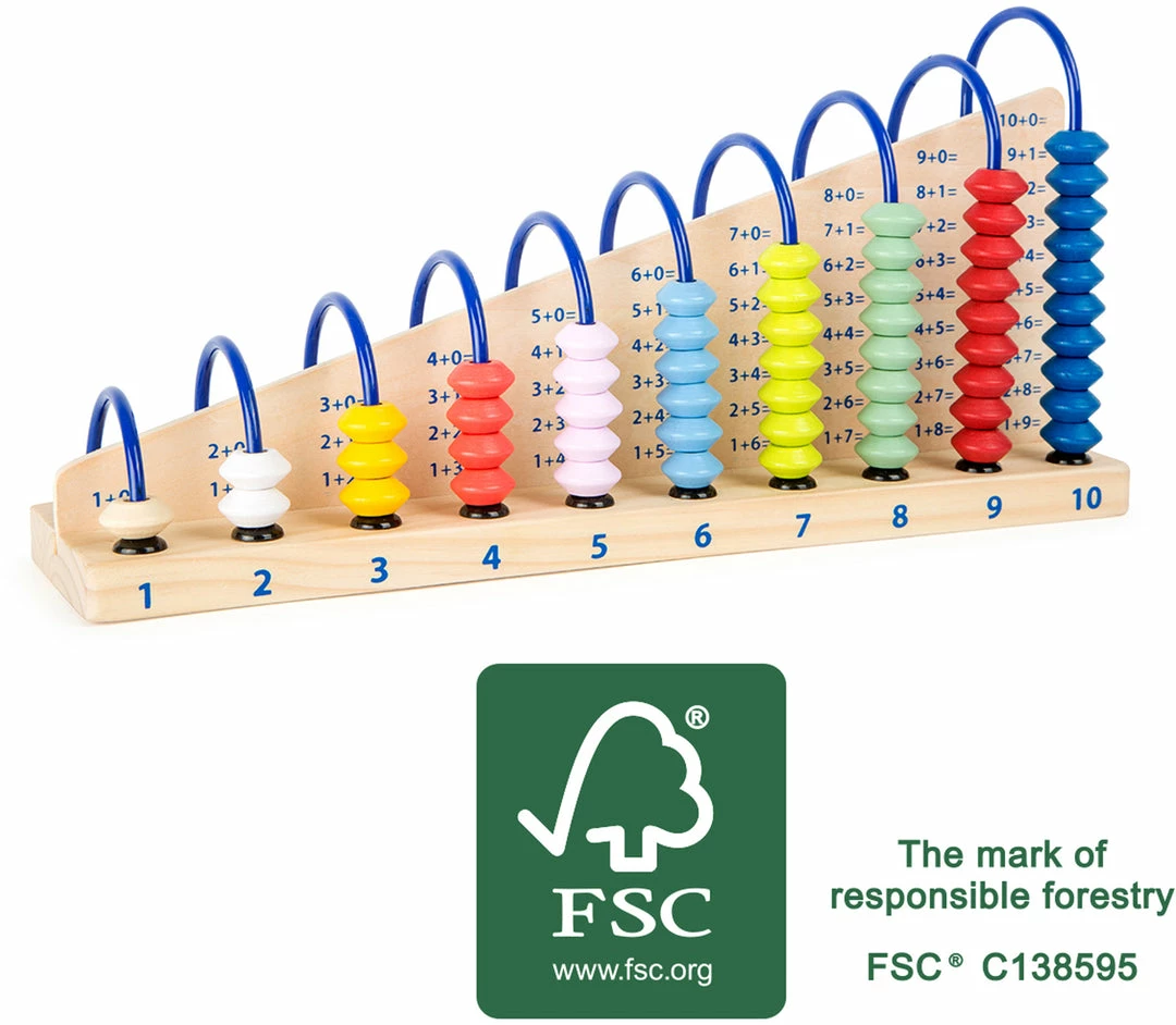 Maths are fun! This abacus made of FSC® 100%-certified wood with its colourful wooden beads serves as a visual maths aide for the first encounters with arithmetic. Children are playfully animated to practice adding and subtracting, which trains their understanding of numbers. Who can solve the first equation?