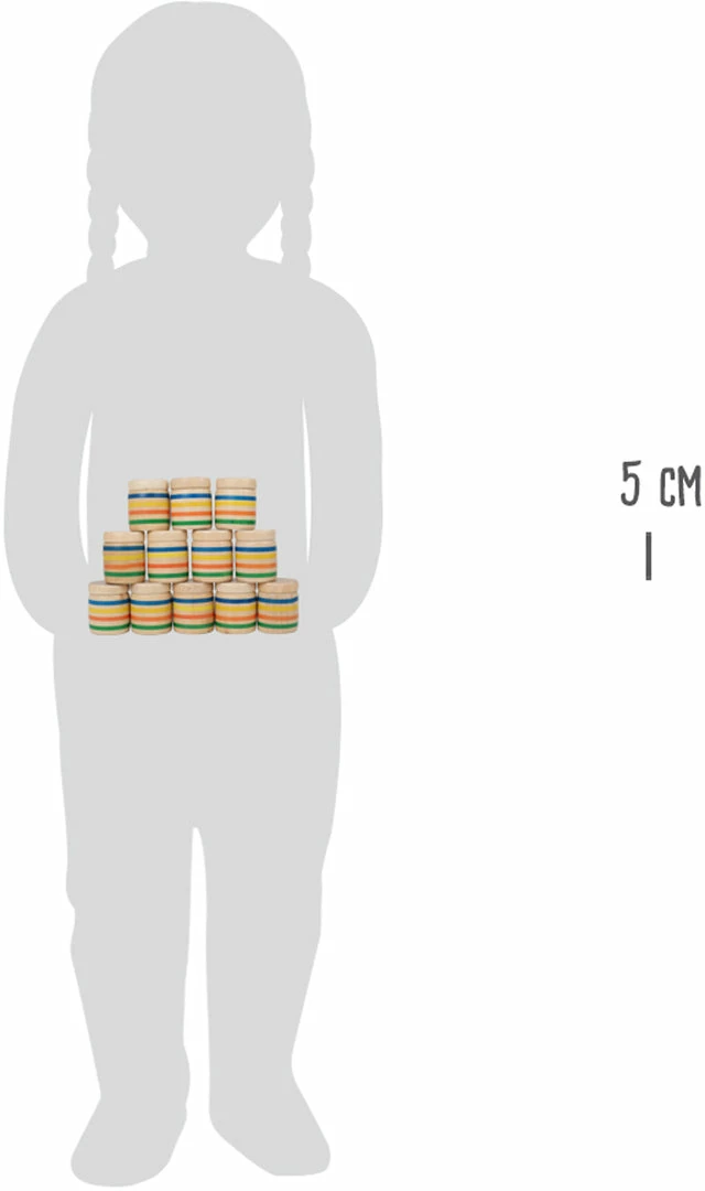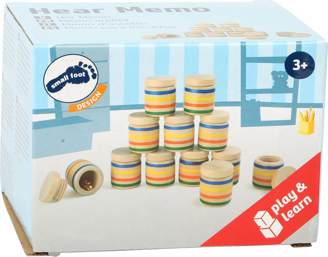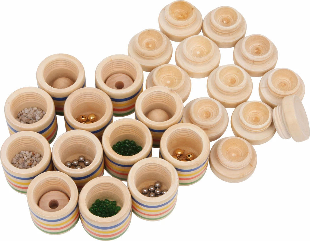 12 high-quality wooden cans with screw cap and adorned with coloured rings which require a special type of memory! Every 2 cans share the same content, and they must be tracked by comparing their sound! The wooden ring makes a different sound than the wooden balls, just like metal balls sound differently than small bells and small pebbles are also different than fine glass beads – can you hear the difference?