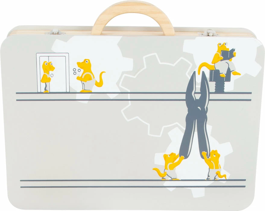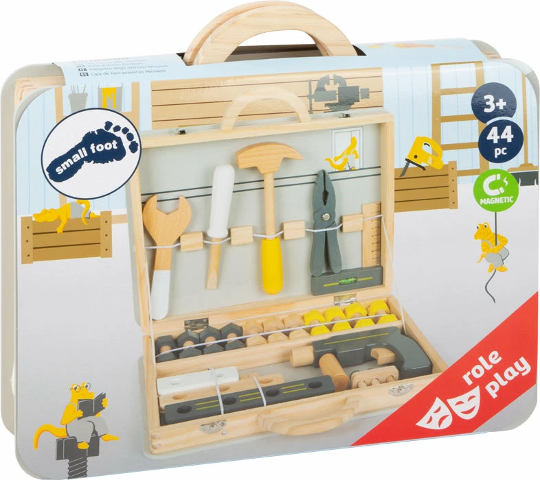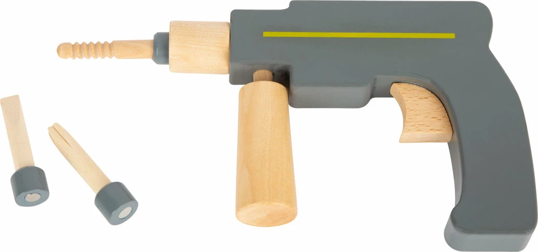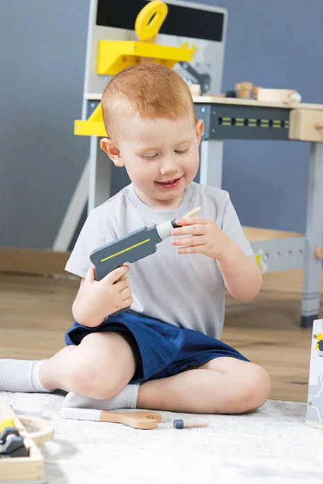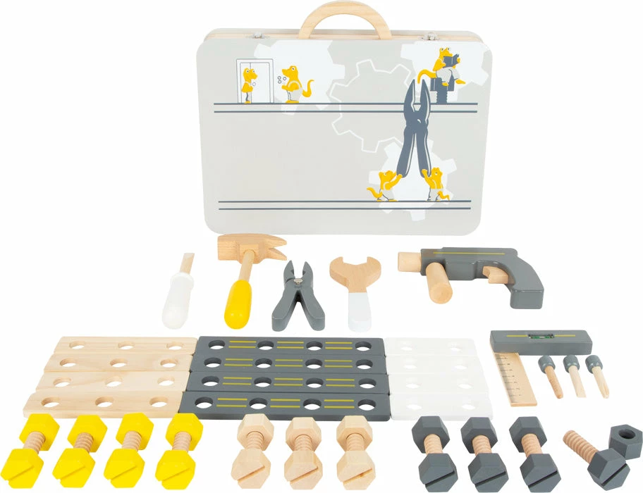 - 6 wooden tools (hammer, wrench, screwdriver, pliers, carpenter’s square with spirit level, cordless screwdriver with magnetic bits)