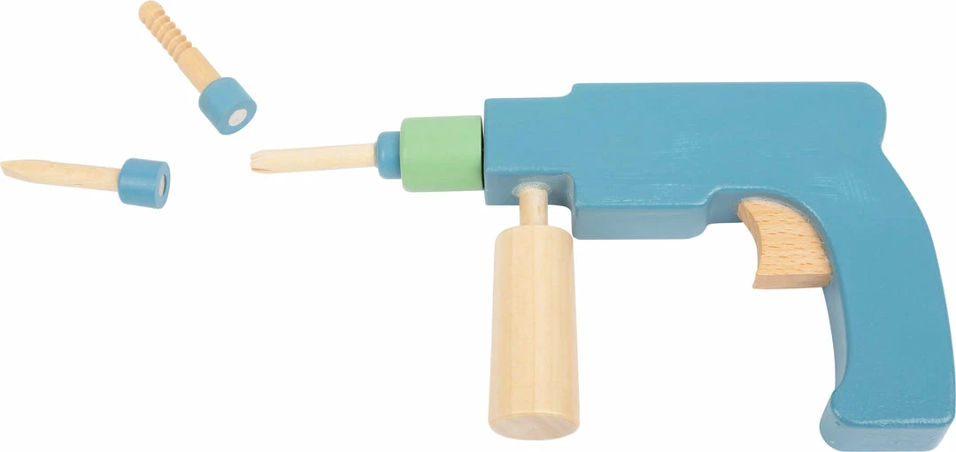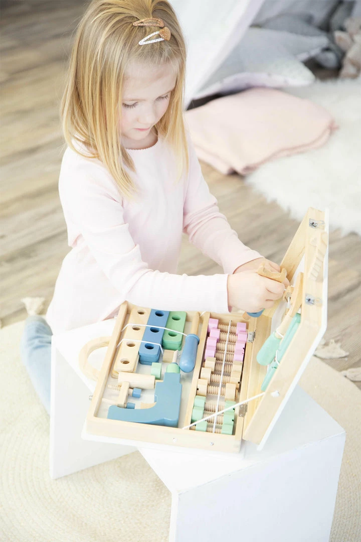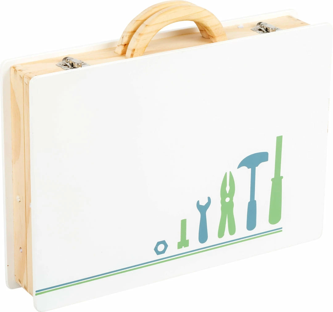 Incl. numerous accessories. Accessories consisting of 5 tools, 1 drill, 3 bits, 11 screws, 11 nuts and 12 perforated strips. The clip fasteners allow everything to be stored safely and with the wooden carrying handles the tool box for boys and girls is ready for the next DIY use.