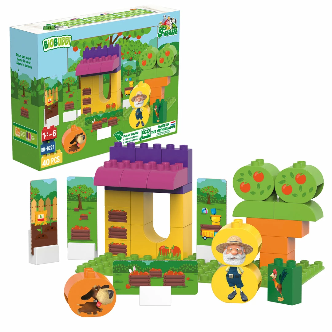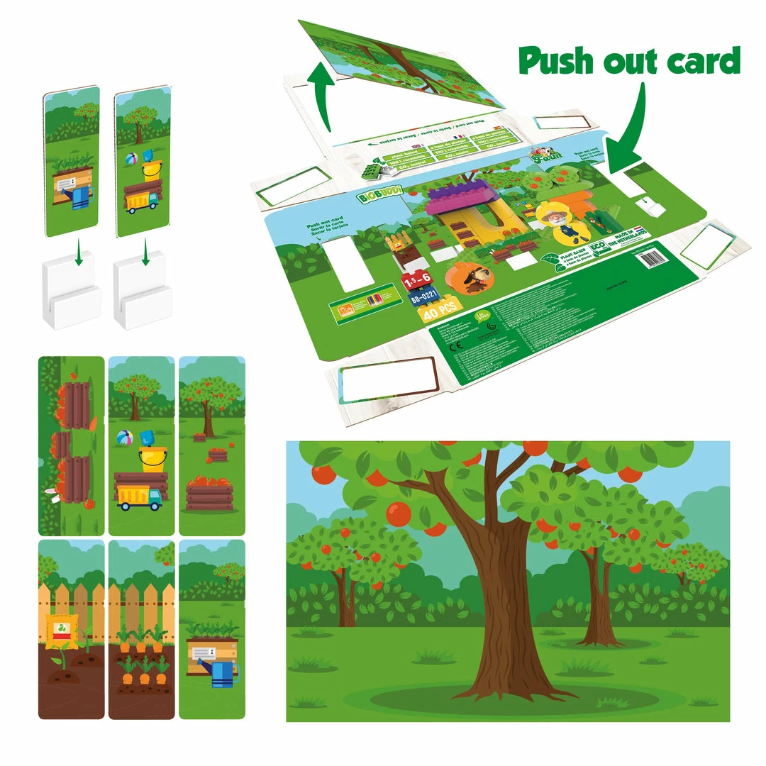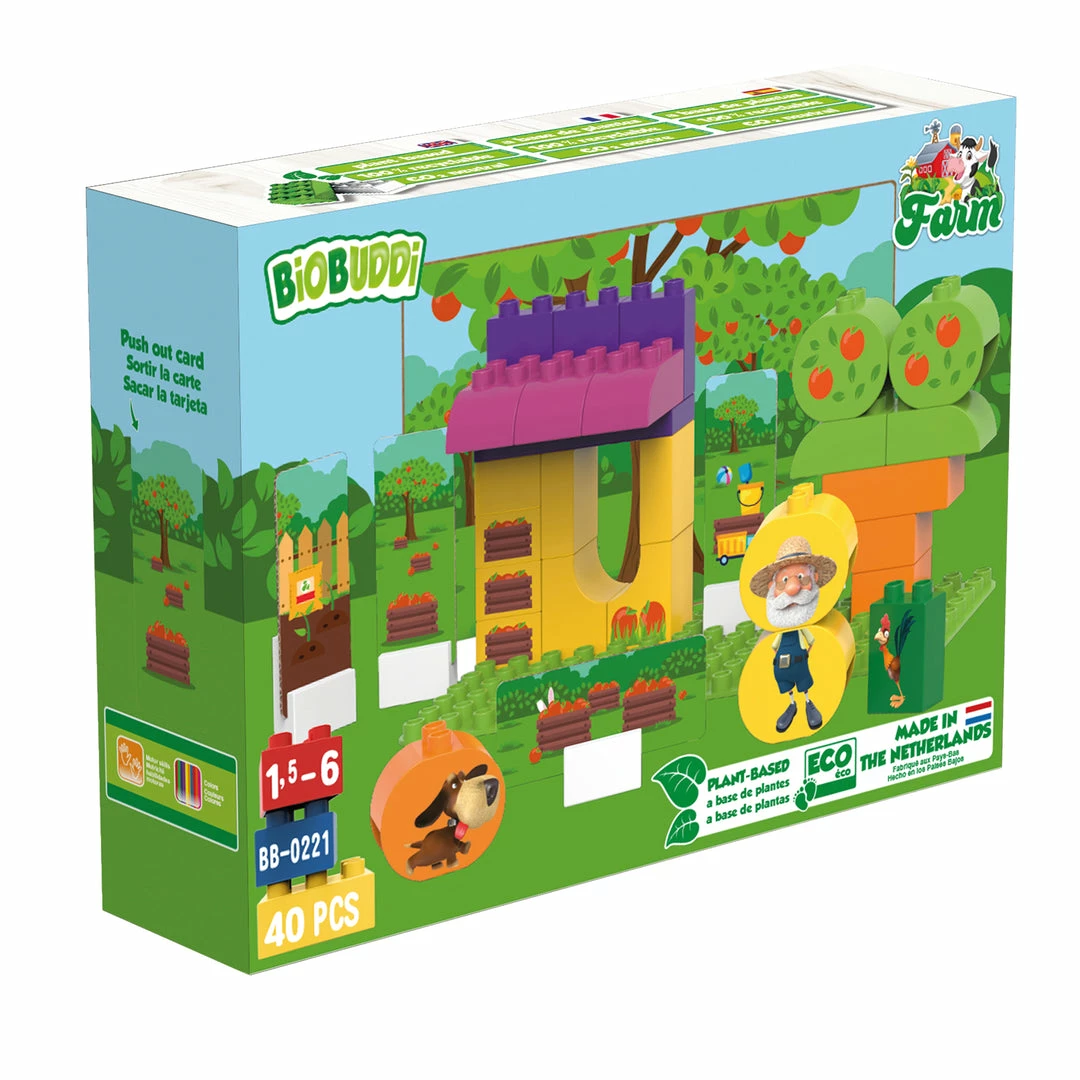 Build your own farm with the building blocks and base plate. There are also 6 express cards and 1 background card that you can easily print out of the packaging and place in the 6 supplied slot blocks for even more fun. All BiOBUDDi packaging is FSC approved and therefore environmentally friendly. So get started with your son or daughter and make your own apple farm.