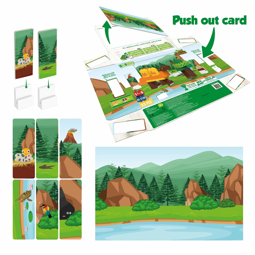 The Stegosaurus toy set is made for children aged 1.5 to 6 years. The toy set consists of 20 different eco friendly building blocks, some of which are printed, as well as 6 slot blocks. The 7 included expression cards are made to make your son or daughter disappear completely into his own dino fantasy world. The express cards are processed in a 100% recyclable packaging. The toy blocks can be combined with blocks from other well-known toy brands.