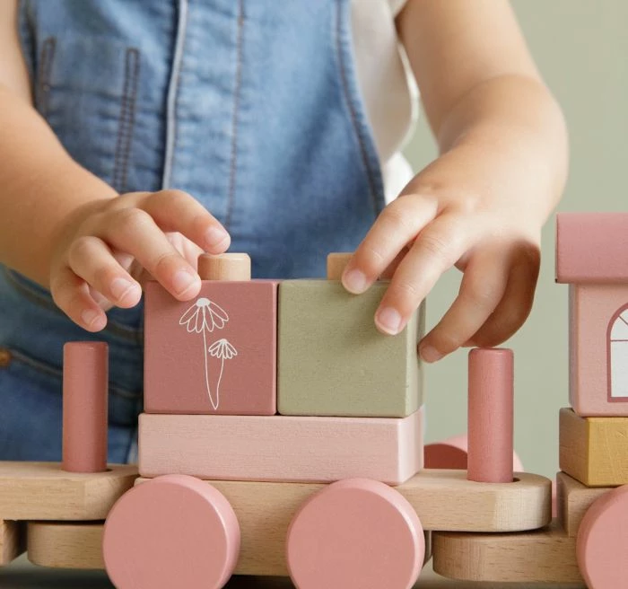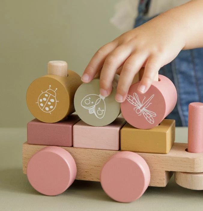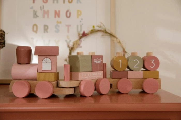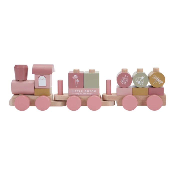 The beautiful Little Dutch wooden train has been decorated with the flowers and insects of the Wild Flowers collection. Build new wagons with these blocks in various shapes and fresh, modern colours. The train consists of 17 parts and is approx. 45 cm long. This toy is always fun to play with and is also a nice accessory for the nursery or child’s bedroom.