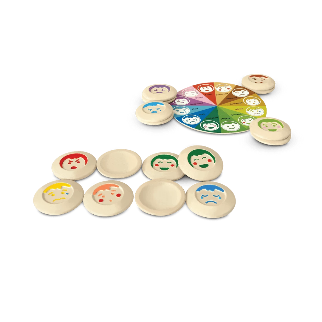 Explore emotions and feelings in this fun memory game. Pair up the 24 wooden counters, each with a face depicting one of twelve moods and place on the colour wheel. This is a great tool for building recall skills but also as a base for discussing emotions with your children.