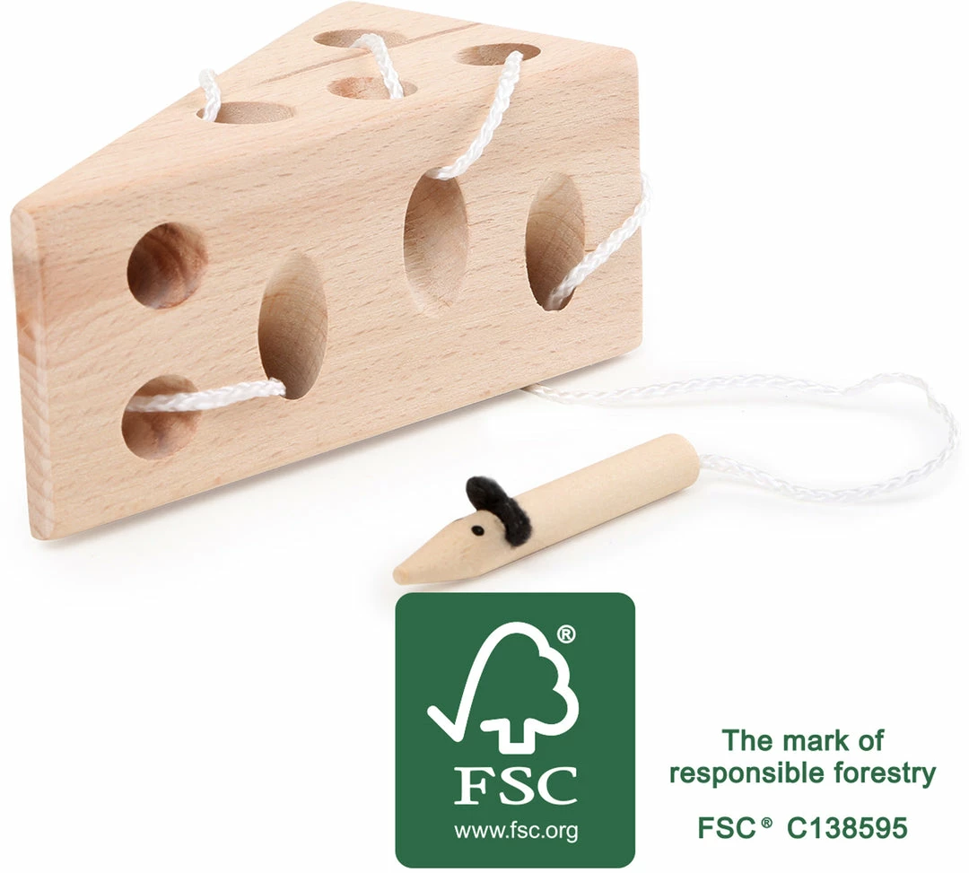 Who’s been eating their way through the cheese? The little mouse, of course! This pretty threading game made of clear-lacquered, FSC® 100%-certified beechwood will train motor skills and patience. With a little dexterity, this little mouse can be playfully and easily threaded through the piece of cheese, training the fine motor skills of the fingers.