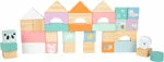 The 34 building blocks which are partially naturally treated and partially painted in soft pastel tones and decorated with happy animals promise double the fun and promote the development of young master builders’ comprehension of shapes, motor skills, and creativity. The rubber-finished wheels protect floors and offer quiet rolling fun. With an integrated axle!