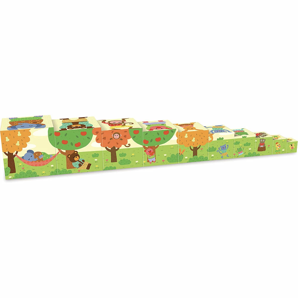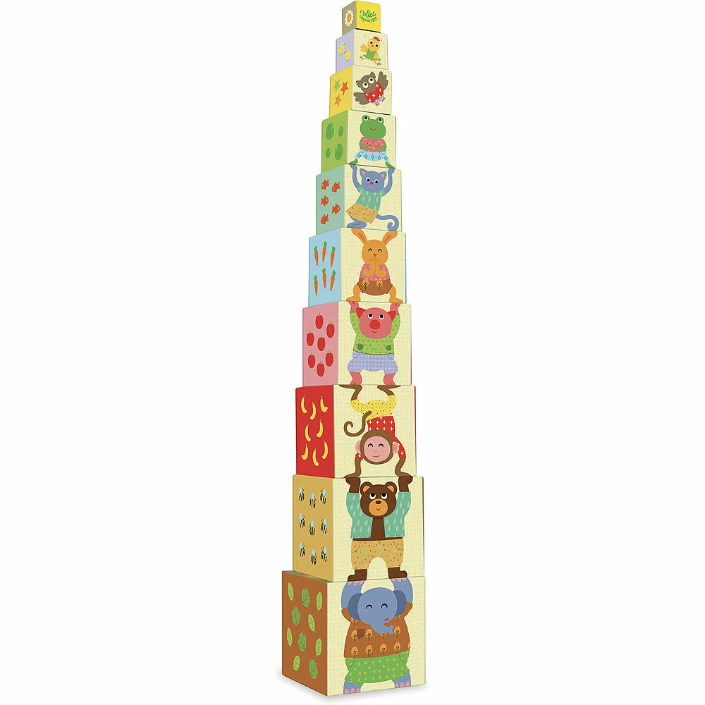 Stack the cubes from the largest to the smallest to form the pyramid of animals, assemble them in vertically or in horizontally. Also learn numbers and counting in a playful and colourful tower populated by funny animals. Total height: 87 cm.