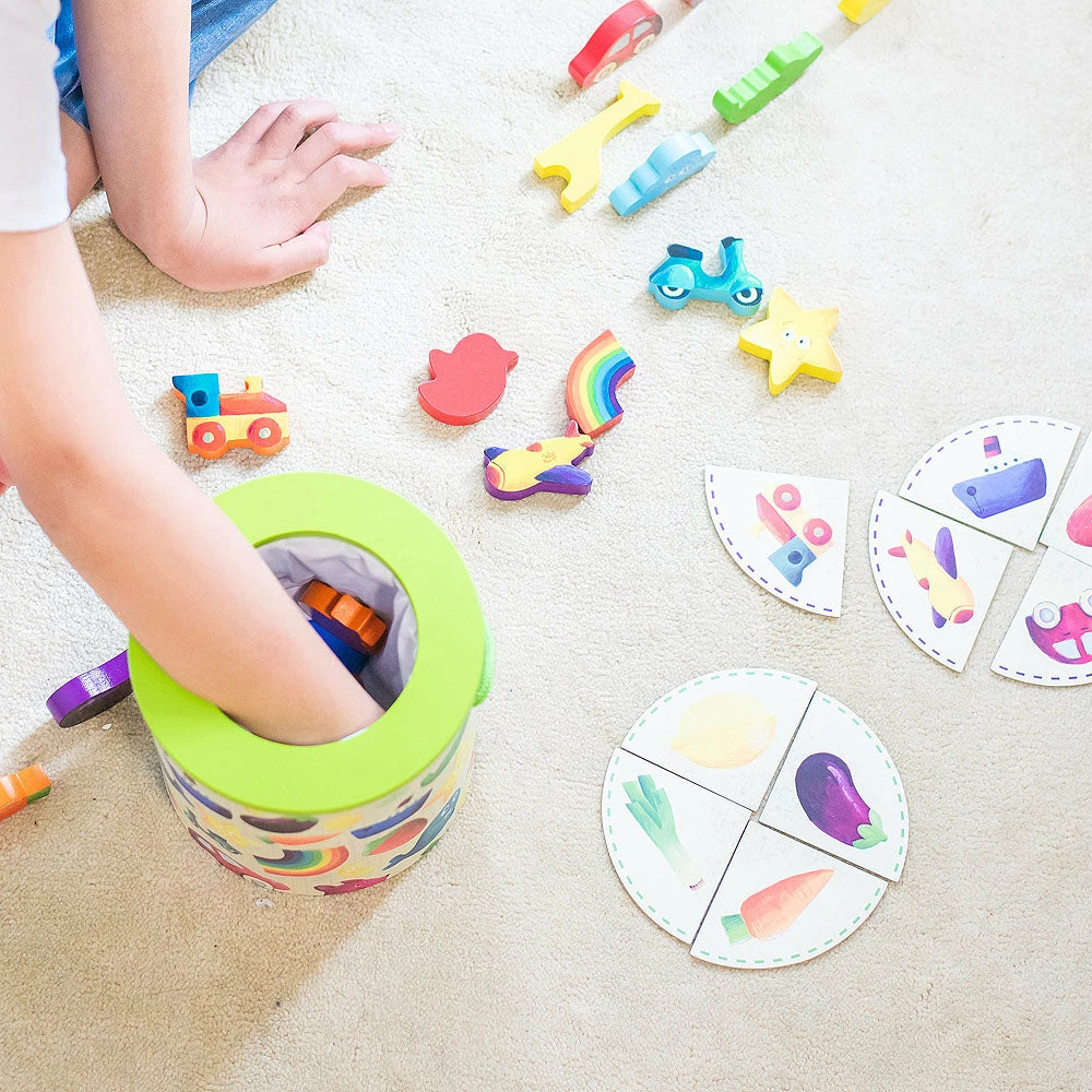 With the illustrated cards, this educational game also turns into a bingo game. Once the game is over, the game is easily collected in the barrel.