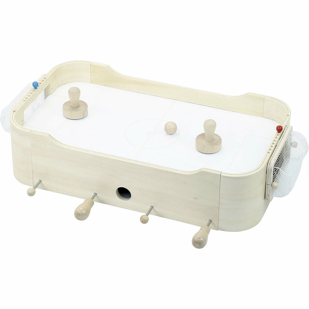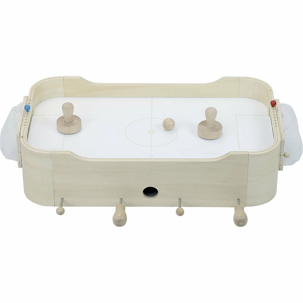 A 2 in 1 wooden board game with an “air hockey” game on one side and a table football on the other. For frenzied parties for young and old alike, a game with a contemporary look that will find its place everywhere.