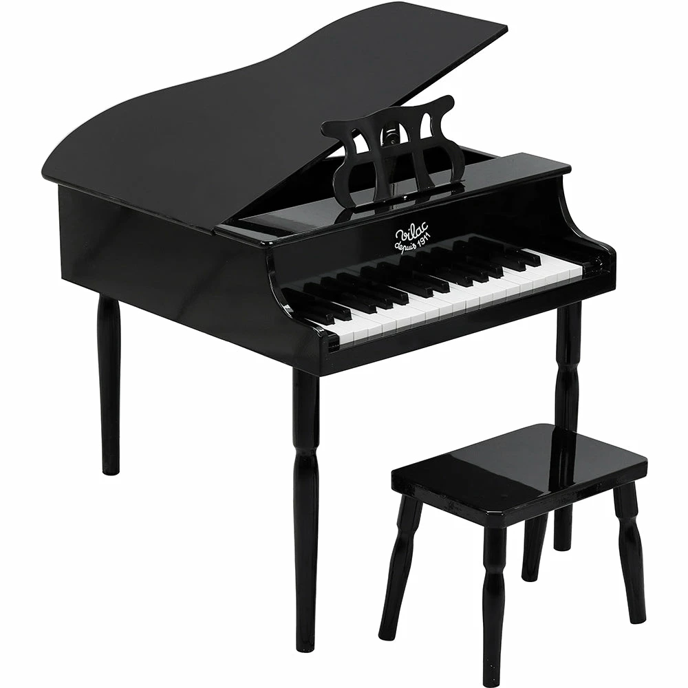 An elegant black grand piano with 30 keys. Comes with sheet music.