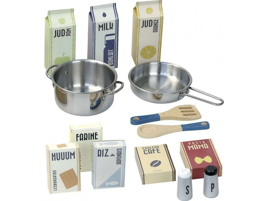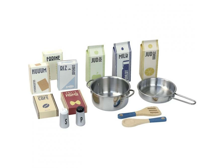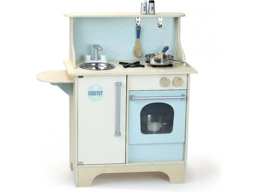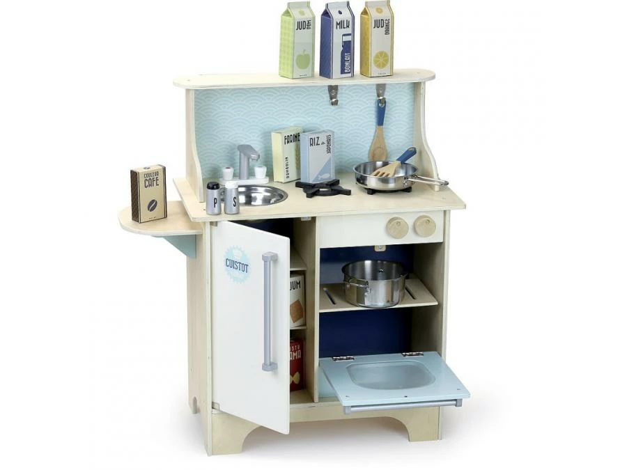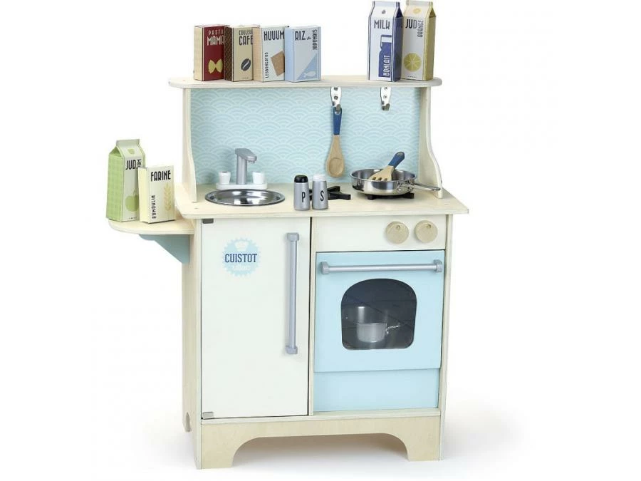 Become a top chef! Pretty wooden kitchen for children – Cuistot model – lagoon blue color – Comes with 14 accessories: 1 wooden salt and pepper shakers, 1 wooden spatula and 1 spoon, 1 metal stewpot and 1 frying pan, 8 mini cardboard packs. A self-assembly.